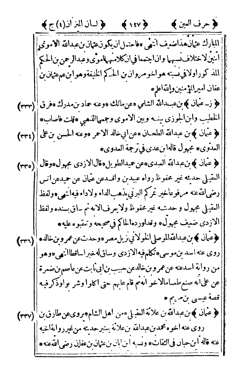 [333] "زعثمان" بن عبد الله الشامي عن مالك وعنه حماد بن مدرك فرق الخطيب وابن الجوزي بينه وبين الأموي وجمعهما الذهبي قلت فأصاب.