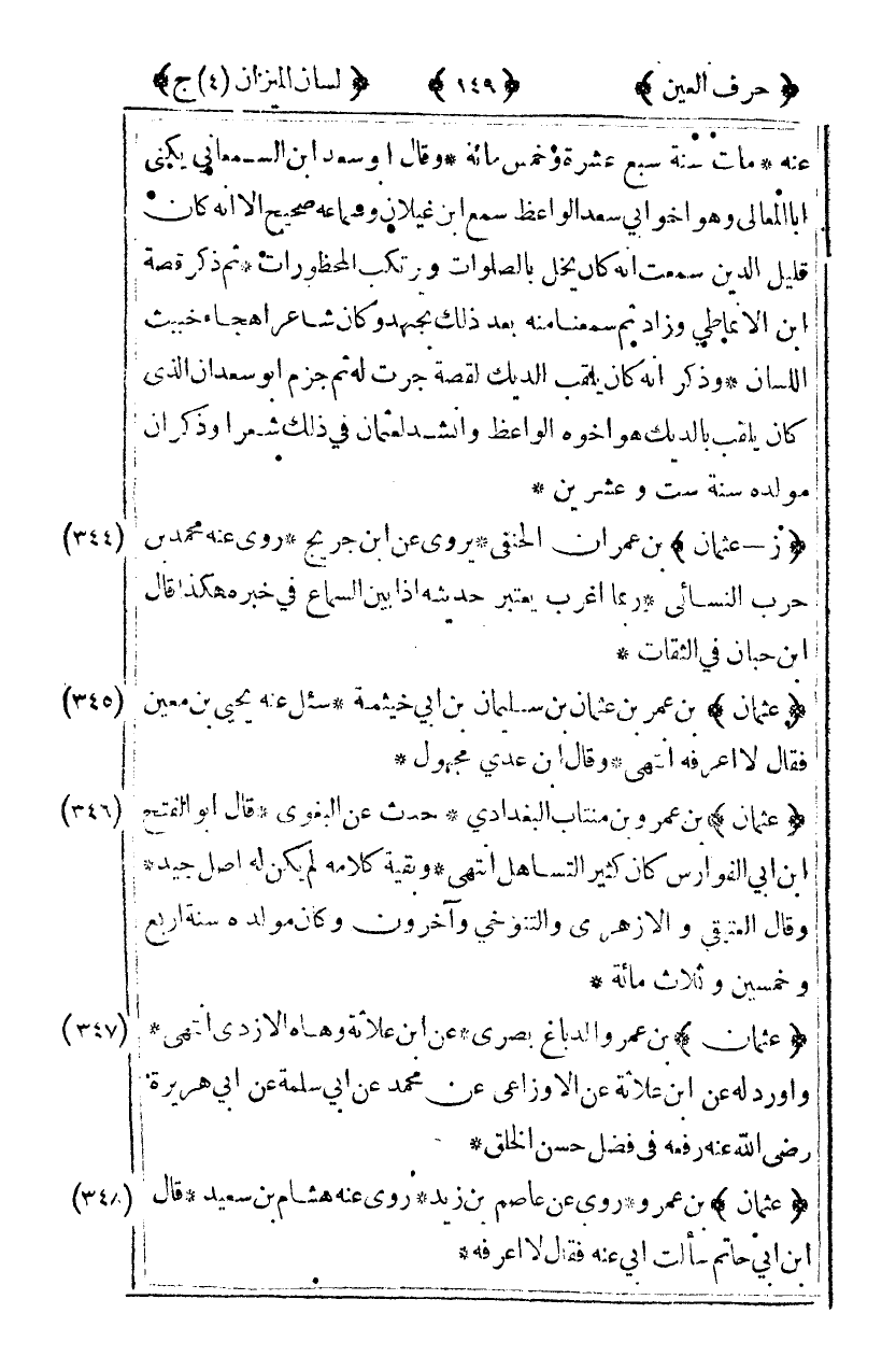 [344] "زعثمان" بن عمران الحنفي يروي عن ابن جريج روى عنه محمد بن حرب النسائي ربما أغرب يعتبر حديثه إذا بين السماع في خبره هكذا قال ابن حبان في الثقات.