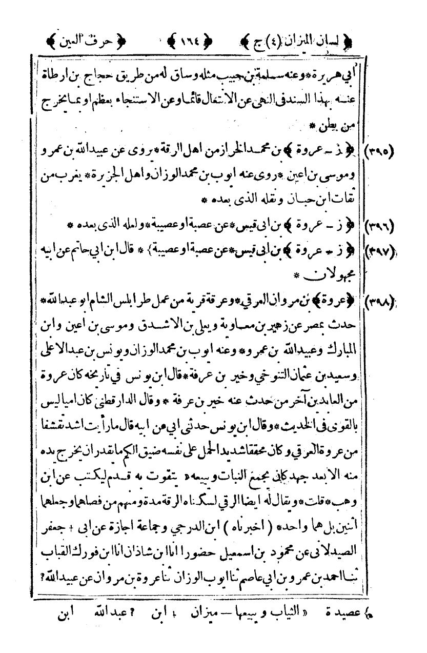 [395] "زعروة" بن محمد الخراز من أهل الرقة يروي عن عبيد الله بن عمرو وموسى بن اعين روى عنه أيوب بن محمد الوزان وأهل الجزيرة يغرب من ثقات ابن حبان ونقله الذي بعده.