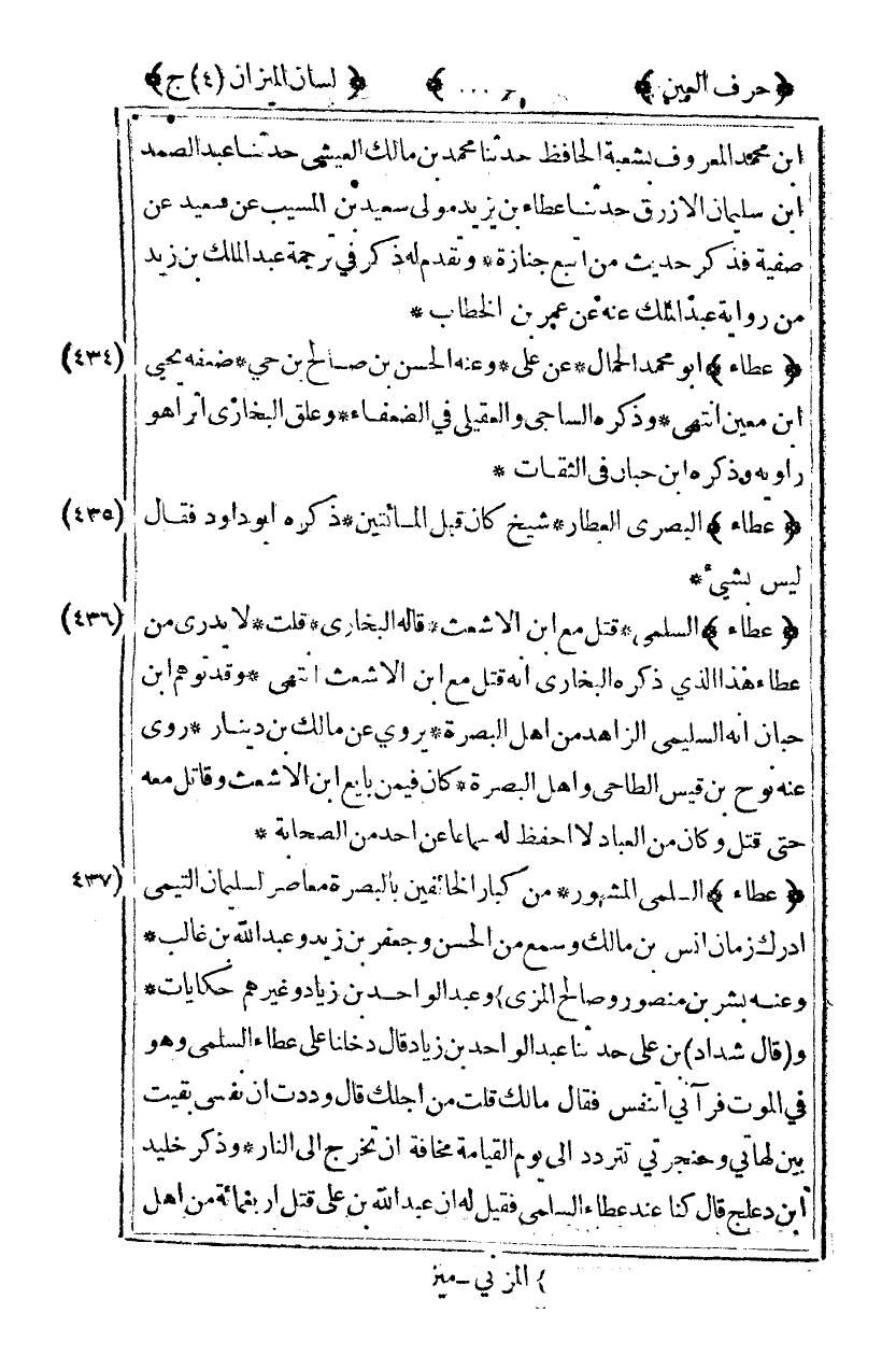 [435] "عطاء" البصري العطار شيخ كان قبل المائتين ذكره أبو داود فقال ليس بشيء.