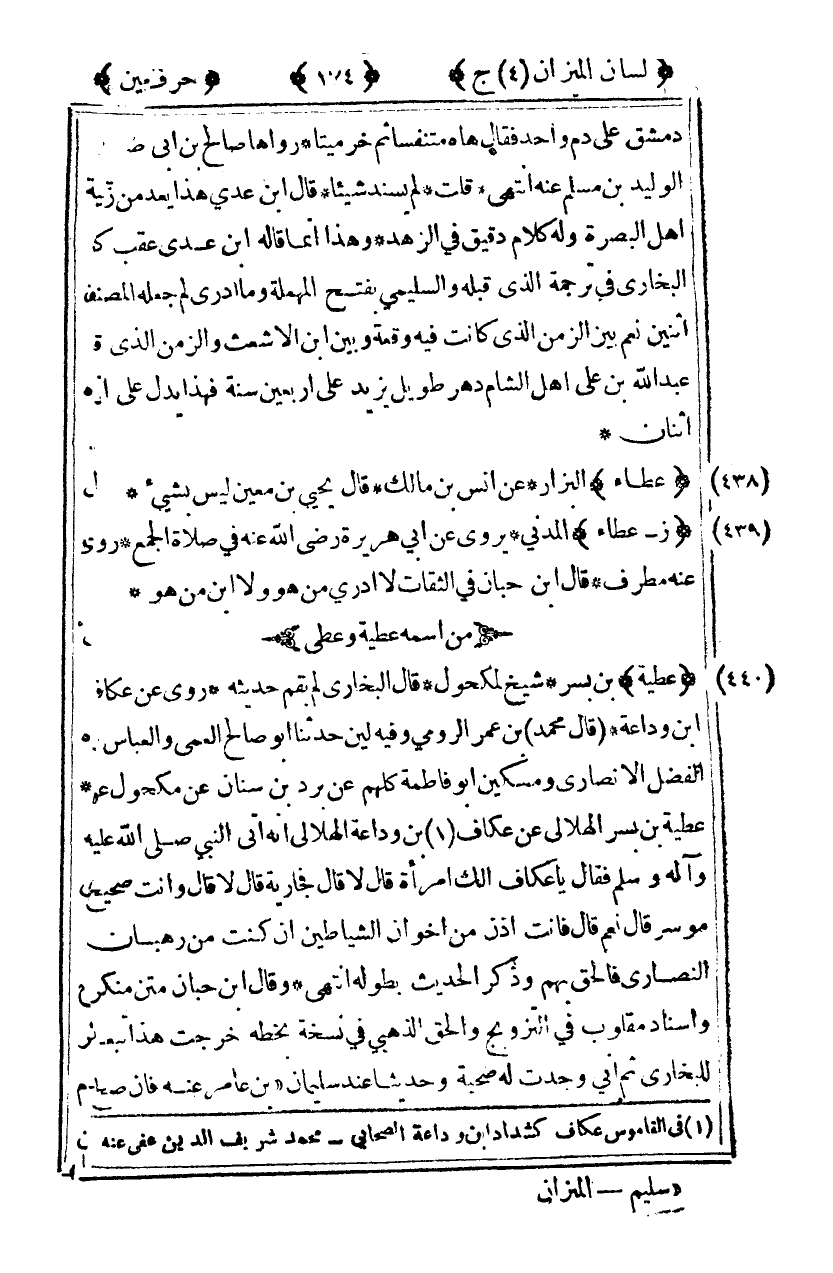 [440] "عطية" بن بسر شيخ لمكحول قال البخاري لم يقدم حديثه روى عنه عكاف بن ودعة [قال محمد] بن عمر الرومي وفيه لين حدثنا أبو صالح العمي والعباس بن الفضل الأنصاري ومسكين أبو فاطمة كلهم عن برد بن سنان عن مكحول عن عطية بن بسر الهلالي عن عكاف1 بن وداعة الهلالي أنه أتى النبي صلى الله عليه وآله وسلم فقال: "يا عكاف ألك امرأة" قال لا قال: "فجارية" قال لا قال: "وأنت صحيح موسر" قال نعم قال: "فأنت اذن من إخوان الشياطين إن كنت من رهبان النصارى فالحق بهم" وذكر الحديث بطوله انتهى وقال ابن حبان متن منكر وإسناد مقلوب في التزويج والحق الذهبي في نسخة بخطه خرجت هذا تبعا للبخاري ثم إني وجدت له صحبة وحديثا عند سليمان2 بن عامر عنه فإن صح