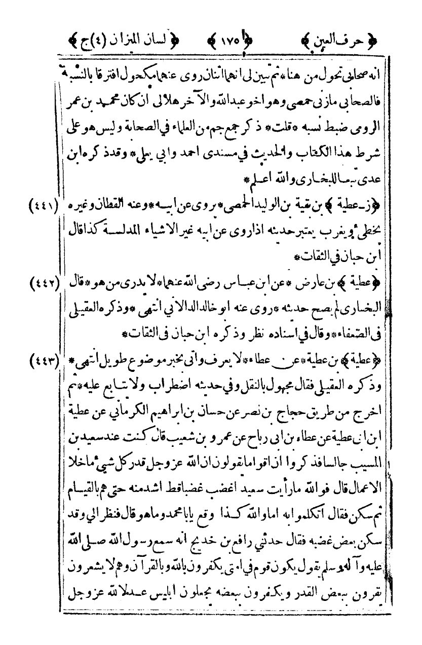 [443] "عطية" بن عطية عن عطاء لا يعرف واتى بخبر موضوع طويل انتهى وذكره العقيلي فقال مجهول بالنقل وفي حديثه اضطراب ولا يتابع عليه ثم أخرج من طريق حجاج بن نصر عن حسان بن إبراهيم الكرماني عن عطية بن أبي عطية عن عطاء بن أبي رباح عن عمرو بن شعيب قال كنت عند سعيد بن المسيب جالسا فذكروا أن أقواما يقولون أن الله عز وجل قدر كل شيء ما خلا الأعمال قال فوالله ما رأيت سعيد أغضب غضبا قط أشد منه حتى هم بالقيام ثم سكن فقال أتكلموا به أما والله كذا وقع يا با محمد وما هو قال فنظر إلي وقد سكن بعض غضبه فقال حدثني رافع بن خديج أنه سمع رسول الله صلى الله عليه وآله وسلم يقول: "يكون قوم في أمتي يكفرون بالله وبالقرآن وهم لا يشعرون يقرون ببعض القدر ويكفرون ببعضه يجعلون إبليس عدلا لله عز وجل