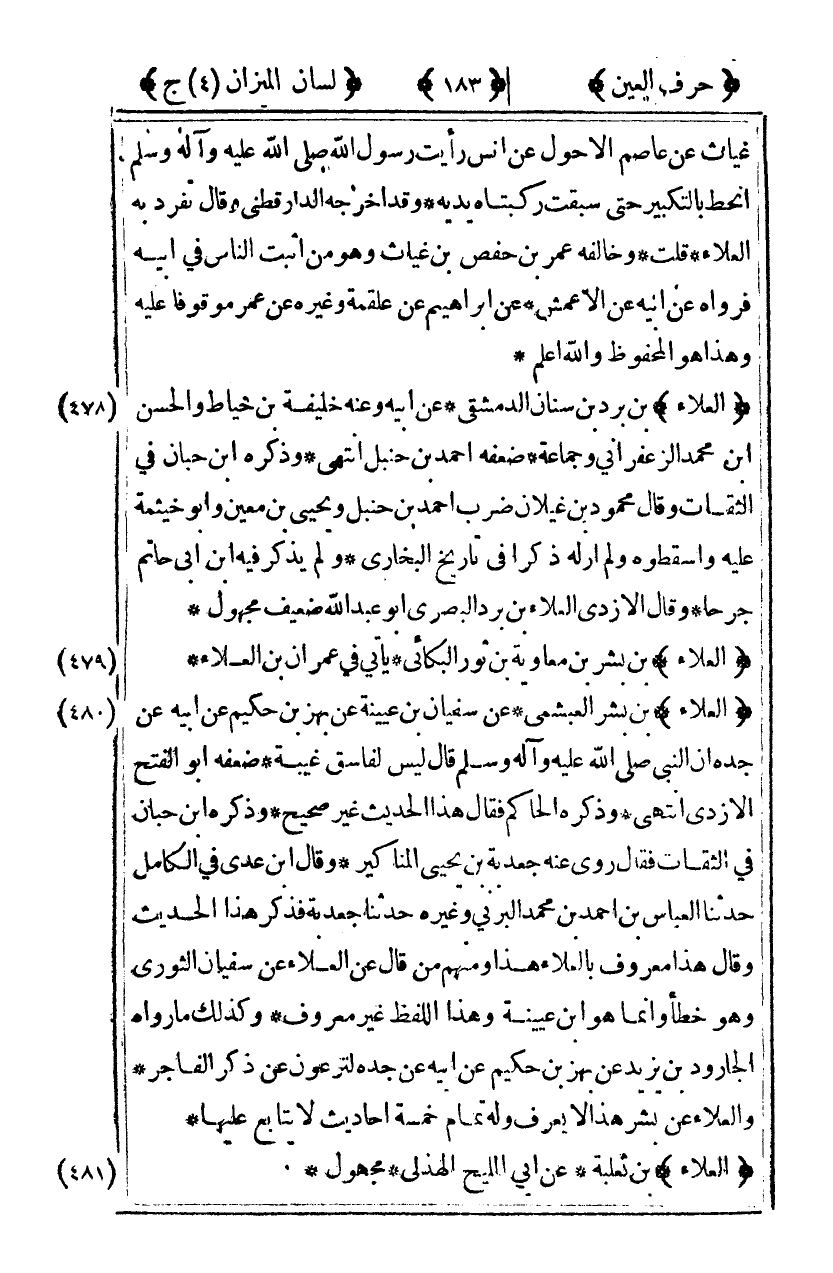 [478] "العلاء" بن برد بن سنان الدمشقي عن أبيه وعنه خليفة بن خياط والحسن بن محمد الزعفراني وجماعة ضعفه أحمد بن حنبل انتهى وذكره ابن حبان في الثقات وقال محمود بن غيلان ضرب أحمد بن حنبل ويحيى بن معين وأبو خيثمة عليه واسقطوه ولم أر له ذكرا في تاريخ البخاري ولم يذكر فيه بن أبي حاتم جرحا وقال الأزدي العلاء بن برد البصري أبو عبد الله ضعيف مجهول.