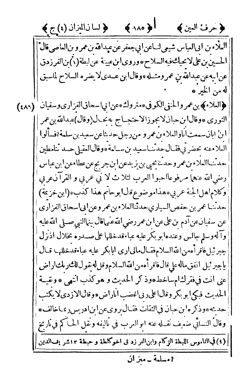 [486] "العلاء" بن عمرو الحنفي الكوفي متروك عن أبي إسحاق الفزاري وسفيان الثوري وقال ابن حبان لا يجوز الإحتجاج به بحال [وقال] عبد الله بن عمر بن أبان سمعت أنا والعلاء بن عمرو من رجل حديثا عن سعيد بن سلمة فسألوا العلاء عنه بحضرتي فقال حدثنا سعيد بن سلمة2 وقال العقيلي حدثنا مطين حدثنا العلاء ابن عمرو حدثنا يحيى بن يزيد عن ابن جريج عن عطاء عن ابن عباس رضي الله عنهما مرفوعا: "أحبوا العرب لثلاث لأني عربي والقرآن عربي وكلام أهل الجنة عربي" هذا موضوع قال أبو حاتم هذا كذب [ابن خزيمة] حدثنا عمر بن حفص السياري حدثنا العلاء بن عمرو عن أبي إسحاق الفزاري عن سفيان عن آدم بن علي عن ابن عمرو رضي الله عنهما قال بينما النبي صلى الله عليه وآله وسلم جالس وعنده أبو بكر عليه عباء قد خللها على صدره بخلال إذ نزل جبرائيل فاقرأه من الله السلام فقال ما لي أرى أبا بكر عليه عباء قد خللها قال يا جبرائيل: "أنفق ماله علي" قال فاقرأه من الله السلام وقل له يقول لك ربك أراض عني أنت في فقرك أم ساخط وذكر الحديث وهو كذب انتهى وبقية الحديث فبكى أبو بكر وقال أعلى ربي أغضب أنا راض وقال الأزدي لا يكتب حديثه وذكره ابن حبان في الثقات فقال يروي عن ابن إدريس ربما خالف وقال النسائي ضعيف نقله عنه أبو العرب في تأليفه ونقل الحاكم في تاريخ