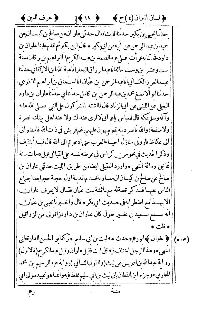 [503] "علوان" أبو رهم حدث عنه ليث بن أبي سليم تركه أبو الحسن الدارقطني انتهى وهذا الرجل اختلف فيه على ليث فقيل علوان وقيل عبد الكريم [فالأول] رواية عبد الله ابن إدريس عن ليث [والقول الثاني] رواية عبد الرحيم بن محمد المحاربي وجزم بن القطان بأن ليث بن أبي سليم غلط فيه وإنما هو بيد مولى أبي