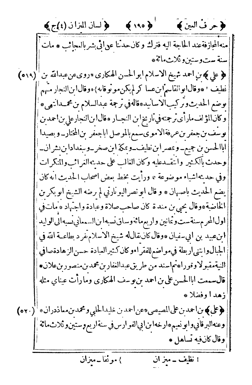 [519] "علي" بن أحمد شيخ الإسلام أبو الحسن الهكاري روى عن عبد الله ابن نطيف1 وقال أبو القاسم ابن عساكر لم يكن موثوقا به2 وقال ابن النجار متهم بوضع الحديث وتركيب الأسانيد قاله في ترجمة عبد السلام بن محمد انتهى وكان المؤلف ما رأى ترجمته في تاريخ بن النجار قال ابن النجار علي بن أحمد بن يوسف بن جعفر بن عرفة الأموي سمع بالموصل أبا جعفر بن المختار وبصيدا أبا الحسن بن جميع وبمصر بن نطيف وبمكة بن صخر وببغداد بن بشران وحدث بالكثير انتقد عليه وكان الغالب على حديثه الغرائب والمنكرات وفي حديثه أشياء موضوعة ورأيت بخط بعض أصحاب الحديث أنه كان يضع الحديث بأصبهان وقال أبو نصر اليونارتي لم يرضه الشيخ أبو بكر بن الخاضبة وقال يحيى بن مندة كان صاحب صلاة وعبادة واجتهاد مات في أول المحرم سنة ست وثمانين وأربع مائة وساق نسبه بن السمعاني نسبه إلى الوليد بن عبيد بن أبي سفيان وقال كان يقال له شيخ الإسلام تفرد بطاعة الله في الجبال وابتنى أربطة في مواضع للفقراء وكان كثير العبادة حسن الزهادة صافي النية مقبولا وقورا ثم أسند من طريق عبد الغفار بن محمد بن منصور بن علان قال سمعت أبا الحسن علي بن أحمد بن يوسف الهكاري وما رأت عيناي مثله زهدا وفضلا.