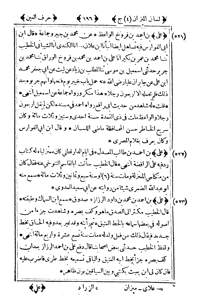[523] "علي" بن أحمد بن محمد بن داود الرزاز2 صدوق سمع بن السماك وطبقته قال الخطيب مكثر إلى الصدق ما هو وكف بصره وشاهدت جزءا من أصوله في بعضها سماعه بالخط العتيق ثم رايته وقد غير بعد وفيه الحاق بخط جديد فيقال ذلك من فعل ولد له مات سنة تسع عشرة وأربع مائة انتهى ولفظ الخطيب حدثني بعض أصحابنا قال دفع على بن أحمد الرزاز بعد أن كف بصره جزأ بخط أبيه العتيق والباقي تسميعه بخط طري فاضرب عليه فإن كان لي بن يعبث بكتبي وبين السياقين بون ظاهر.