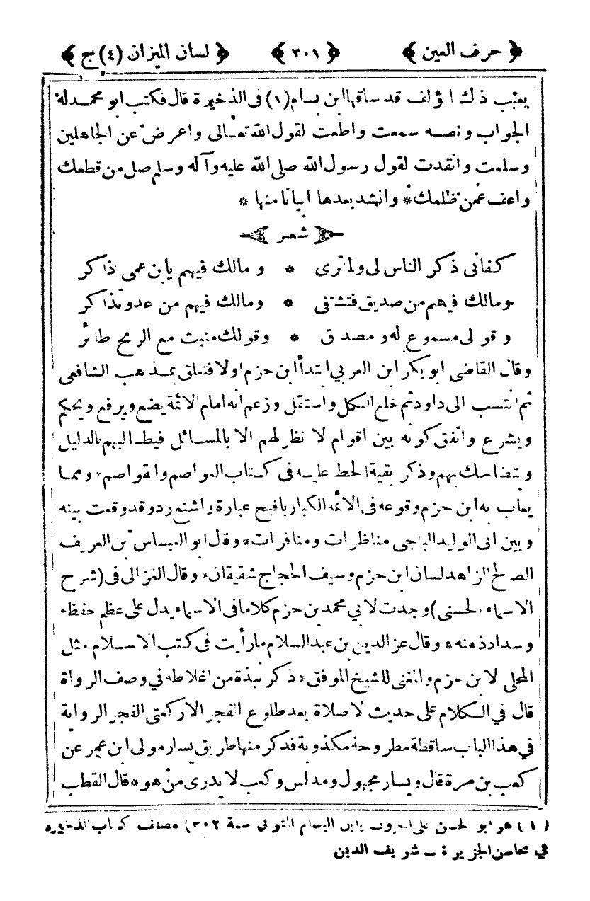 وقال القاضي أبو بكر بن العربي ابتدأ ابن حزم أولا فتعلق بمذهب الشافعي ثم انتسب إلى داود ثم خلع الكل واستقل وزعم أنه إمام الأئمة يضع ويرفع ويحكم ويشرع واتفق كونه بين أقوام لا نظر لهم إلا بالمسائل فيطالبهم بالدليل ويتضاحك بهم وذكر بقية الحط عليه في كتاب العواصم والقواصم ومما يعاب به بن حزم وقوعه في الأئمة الكبار بأقبح عبارة وأشنع رد وقد وقعت بينه وبين أبي الوليد الباجي مناظرات ومنافرات وقال أبو العباس بن العريف الصالح الزاهد لسان بن حزم وسيف الحجاج شقيقان وقال الغزالي في شرح الأسماء الحسنى وجدت لأبي محمد بن حزم كلاما في الأسماء يدل على عظم حفظه وسداد ذهنه وقال عز الدين بن عبد السلام ما رأيت في كتب الإسلام مثل المحلي لابن حزم والمغني للشيخ الموفق ذكر نبذة من أغلاطه في وصف الرواة قال في الكلام على حديث لا صلاة بعد طلوع الفجر إلا ركعتي الفجر الرواية في هذ الباب ساقطة مطروحة مكذوبة فذكر منها طريق يسار مولى ابن عمر عن كعب بن مرة قال ويسار مجهول ومدلس وكعب لا يدري من هو قال القطب