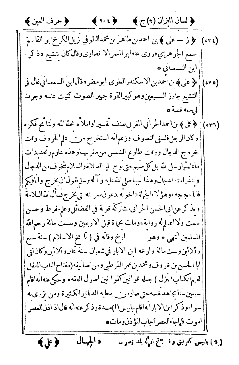 [536] "علي" بن أحمد الحراني المغربي صنف تفسيرا وأملاه بحقائقه ونتائج فكره وكان الرجل فلسفي التصوف وزعم أنه استخرج من علم الحروف وقت خروج الدجال ووقت طلوع الشمس من مغربها وهذه علوم وتحديدات ما علمتها رسل الله بل كل منهم حتى نوح صلى الله عليه وآله وسلم يتخوف من الدجال وينذر أمته الدجال وهذا نبينا صلى الله عليه وآله وسلم يقول: "أن يخرج وأنا فيكم فأنا حجيجه" وهؤلاء الجهالة1 أخوته يدعون معرفته حتى يخرج نسأل الله السلامة ويذكر عن أبي الحسن الحراني مشاركة قوية في الفضائل وعلم مفرط وحسن سمعت ولا أعلم له روايته ومات بحماة قبل الأربعين وست مائة رحم الله المسلمين انتهى وهو أرخ وفاته في [تاريخ الإسلام] سنة سبع وثلاثين وست مائة وأرخه ابن الأبار في شعبان سنة ثمان وثلاثين وكان لقي أبا الحسن بن خروف ومحمد ابن عمر القرطبي ومن تصانيفه مفتاح الباب المقفل لفهم الكتاب المنزل جعله قوأنين كقوأنين أصوله الفقه وحكى عنه أنه أقام سبعين سنة يجاهد نفسه حتى صار من يعطيه الدنانير الكثيرة ومن يزري به سواء وذكر بن الأبار أنه أقام ببلبيس2 مدة وذكر عنه أنه قال إذا أذن العصر أموت فلما جاء العصر أجاب المؤذن ومات.
