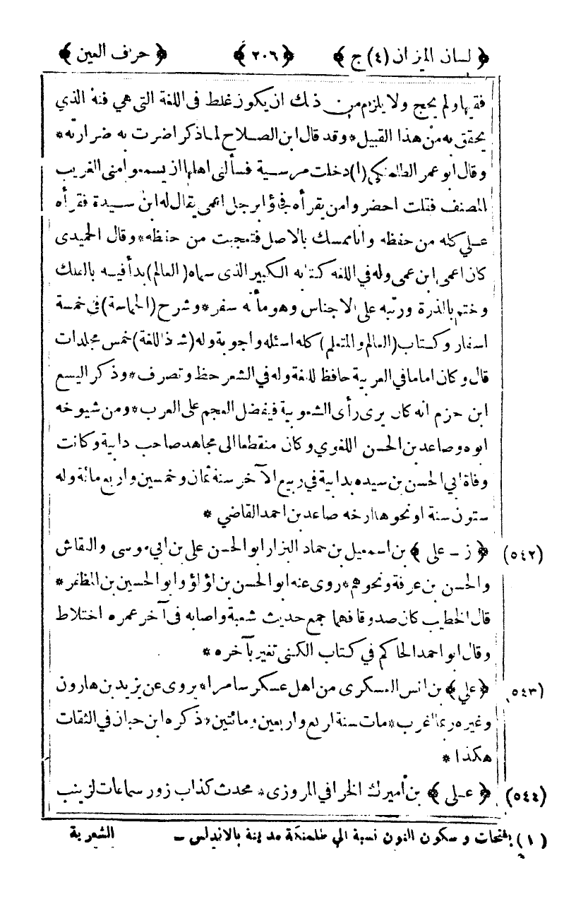 فقيها ولم يحج ولا يلزم من ذلك أن يكون غلط في اللغة التي هي فنه الذي يحقق به من هذا القبيل وقد قال ابن الصلاح لما ذكر اضرت به ضرارته وقال أبو عمر الطلمنكي1 دخلت مرسية فسألني أهلها أن يسمعوا مني الغريب المصنف فقلت احضروا من يقرأه فجاؤوا برجل أعمى يقال له ابن سيدة فقرأه علي كله من حفظه وأنا ممسك بالأصل فتعجبت من حفظه وقال الحميدي كان أعمى بن عمى وله في اللغة كتابه الكبير الذي سماه [العالم] بدأ فيه بالفلك وختم بالذرة ورتبه على الأجناس وهو مائه سفر وشرح [الحماسة] في خمسة اسفار وكتاب [العالم والمتعلم] كله أسئلة وأجوبة وله [شذا اللغة] خمس مجلدات قال وكان إماما في العربية حافظ للغة وله في الشعر حظ وتصرف وذكر اليسع بن حزم أنه كان يرى رأي الشعوبية فيفضل العجم على العرب ومن شيوخه أبوه وصاعد بن الحسن اللغوي وكان منقطعا إلى مجاهد صاحب دابية وكانت وفاة أبي الحسن بن سده بداية في ربيع الآخر سنة ثمان وخمسين وأربع مائة وله ستون سنة أو نحوها أرخه صاعد بن أحمد القاضي.