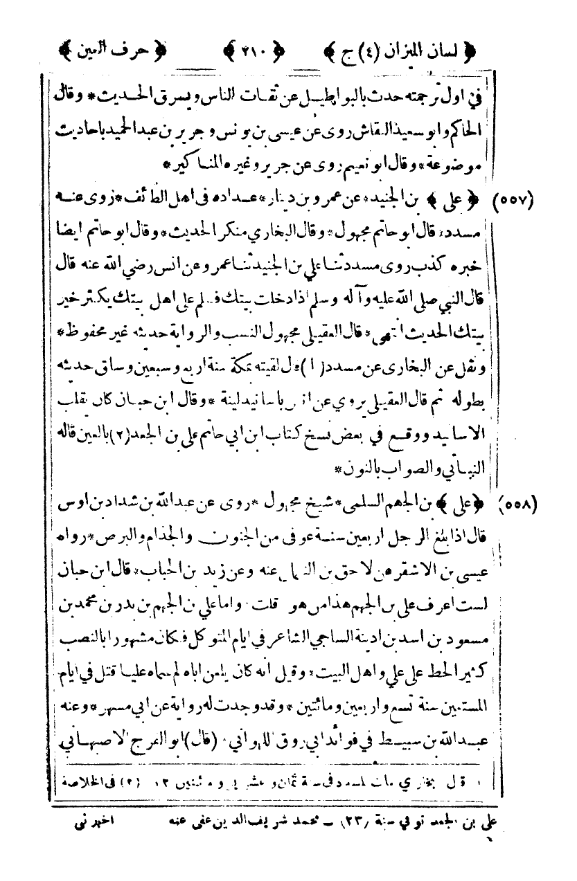 [557] "علي" بن الجنيد عن عمرو بن دينار عداده في أهل الطائف روى عنه مسدد قال أبو حاتم مجهول وقال البخاري منكر الحديث وقال أبو حاتم أيضا خيره كذب روى مسدد ثنا علي بن الجنيد ثنا عمرو عن أنس رضي الله عنه قال قال النبي صلى الله عليه وآله وسلم: "إذا دخلت بيتك فسلم على أهل بيتك يكثر خير بيتك" الحديث انتهى قال العقيلي مجهول النسب والرواية حديثه غير محفوظ ونقل عن البخاري عن مسدد1 قال لقيته بمكة سنة أربع وسبعين وساق حديثه بطوله ثم قال العقيلي يروي عن أنس بأسانيد لينه وقال ابن حبان كان يقلب الأسانيد ووقع في بعض نسخ كتاب بن أبي حاتم علي بن الجعد2 بالعين قاله النسائي والصواب بالنون.