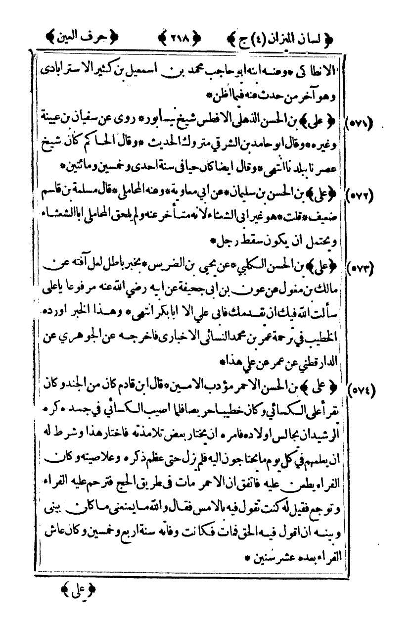 [574] "علي" بن الحسن الأحمر مؤدب إلامين قال ابن قادم كان من الجند وكان يقرأ علي الكسائي وكان خطيبا حريصا فلما أصيب الكسائي في جسده كره الرشيد أن يجالس أولاده فأمره أن يختار بعض تلامذته فاختار هذا وشرط له أن يعلمهم في كل يوم ما يحتاجون إليه فلم يزل حتى عظم ذكره وعلا صيته وكان الفراء يطعن عليه فاتفق أن الأحمر مات في طريق الحج فترحم عليه الفراء وتوجع فقيل له كنت تقول فيه بإلامس فقال والله ما يمنعني ما كان بيني وبينه أن أقول فيه الحق فمات فكانت وفاته سنة أربع وخمسين وكان عاش الفراء بعده عشر سنين.