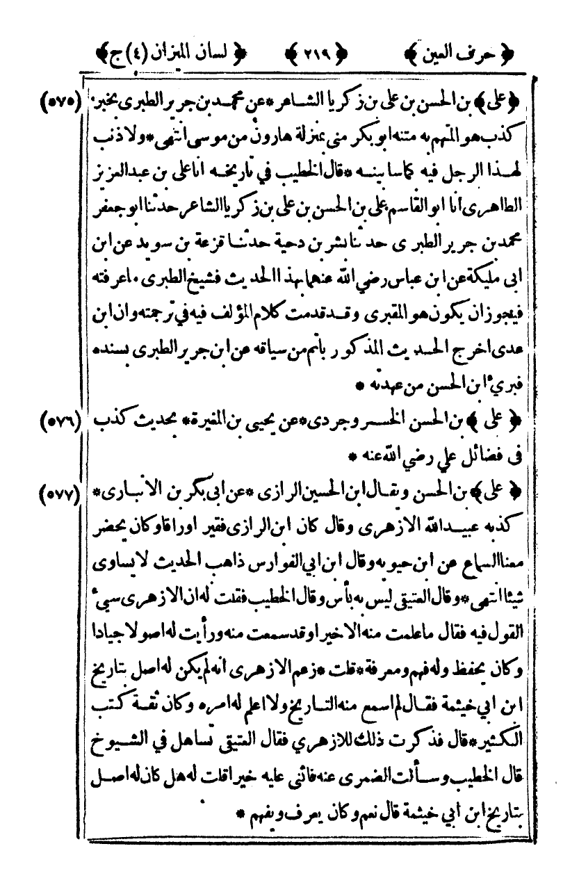 [575] "علي" بن الحسن بن علي بن زكريا الشاعر عن محمد بن جرير الطبري بخبر كذب هو المتهم به ومتنه أبو بكر مني بمنزلة هارون موسى انتهى ولا ذنب لهذا الرجل فيه كما سأبينه قال الخطيب في تاريخه أنا علي بن عبد العزيز الطاهري أنا أبو القاسم علي بن الحسن بن علي بن زكريا الشاعر حدثنا أبو جعفر محمد بن جرير الطبري حدثنا بشر بن دحية حدثنا قزعة بن سويد عن ابن أبي مليكة عن ابن عباس رضي الله عنهما بهذا الحديث فشيخ الطبري أعرفته فيجوز أن يكون هو المقبري وقد قدمت كلام المؤلف فيه ترجمته وأن ابن عدي أخرج الحديث المذكور بأتم من سياقه عن ابن جرير الطبري بسنده فبريء بن الحسن من عهدته.