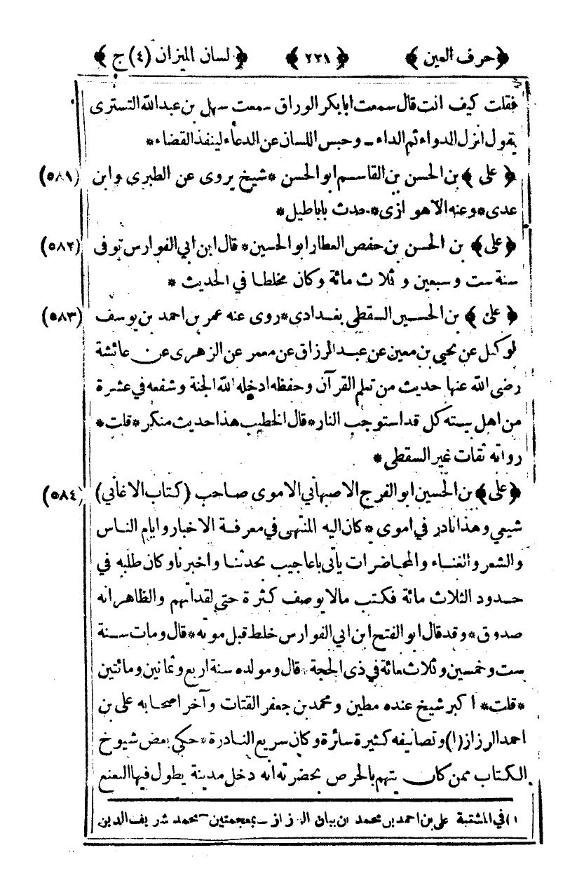 [582] "علي" بن الحسن بن حفص العطار أبو الحسين قال ابن أبي الفوارس توفي سنة ست وسبعين وثلاث مائة وكان مخلطا في الحديث.
