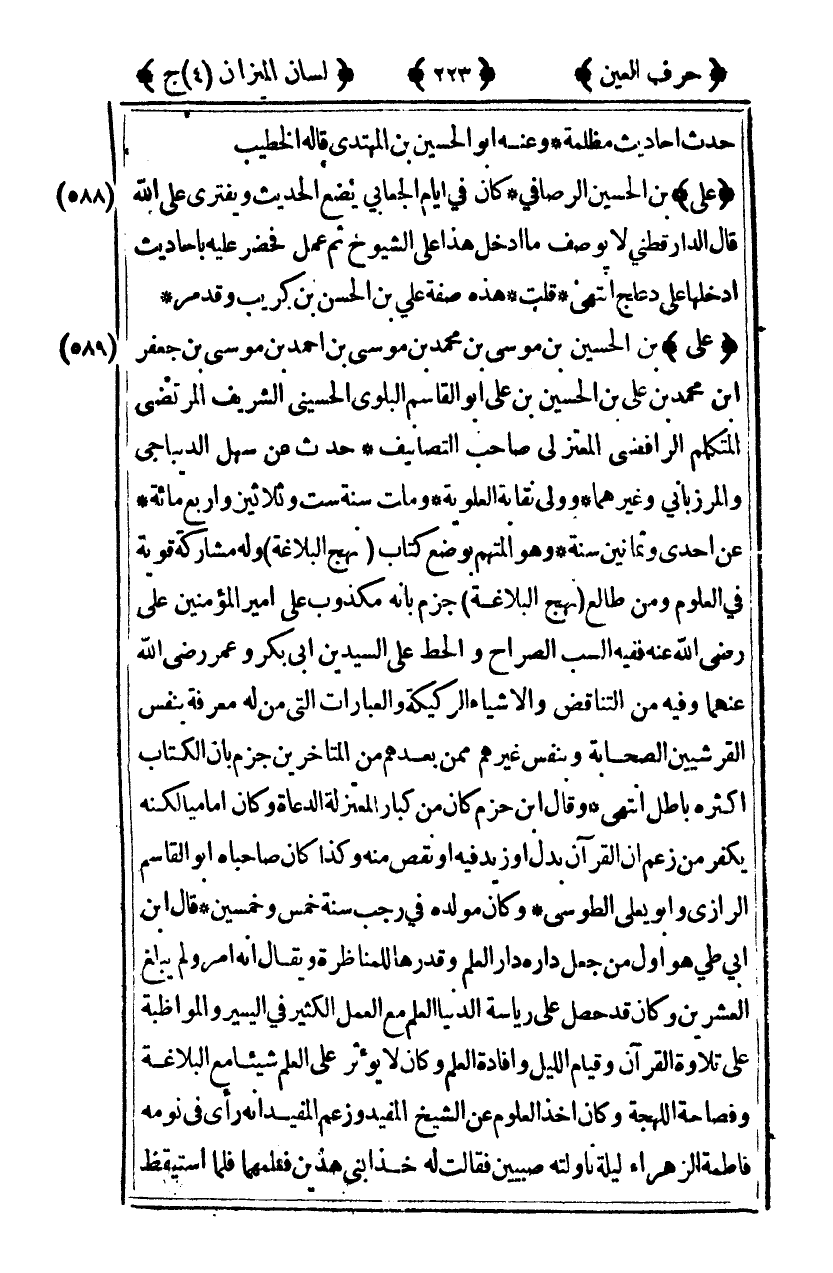 [589] "علي" بن الحسن بن موسى بن محمد بن موسى بن إبراهيم بن موسى بن جعفر بن محمد بن علي بن الحسين بن علي بن أبي طالب أبو القاسم العلوي الحسيني الشريف المرتضى المتكلم الرافضي المعتزلي صاحب التصانيف حدث عنه سهل الديباجي والمرزباني وغيرهما وولي نقبة العلوي ومات سنة ست وثلاثين وأربع مائة عن إحدى وثمانين سنة وهو المهم بوضع كتاب [نهج البلاغة] وله مشاركة قوية في العلوم ومن طالع [نهج البلاغة] جزم بأنه مكذوب على أمير المؤمنين علي رضي الله عنه ففيه السب الصراح والحط على السيدين أبي بكر وعمر رضي الله عنهما وفيه من التناقض والأشياء الركيكة والعبارات التي من له معرفة بنفس القرشيين الصحابة وبنفس غيرهم ممن بعدهم من المتأخرين جزم بأن الكتاب أكثره باطل أنهى وقال ابن حزم كان من كبار المعتزلة الدعاة وكان إماميا لكنه يكفر من زعم أن القرآن بدل أو زيد فيه أو نقص منه وكذا كان صاحباه أبو القاسم الرازي وأبو يعلى الطوسي وكان مولده في رجب سنة خمس وخمسين قال ابن أبي طي هو أول من جعل داره دار العلم وقدرها للمناظرة ويقال أنه أمر ولم يبلغ العشرين وكان قد حصل على رياسة الدنيا العلم مع العلم الكثير في اليسير والمواظبة على تلاوة القرآن وقيام الليل وأفادة العلم وكان لا يؤثر على العلم شيئا مع البلاغة وفصاحة اللهجة وكان أخذا العوم عن الشيخ المفيد وزعم المفيد أنه رأى في نومه فاطمة الزهراء ليلة ناولته صبيين فقال له خذ ابني هذين فعلمهما فلما استيقظ
