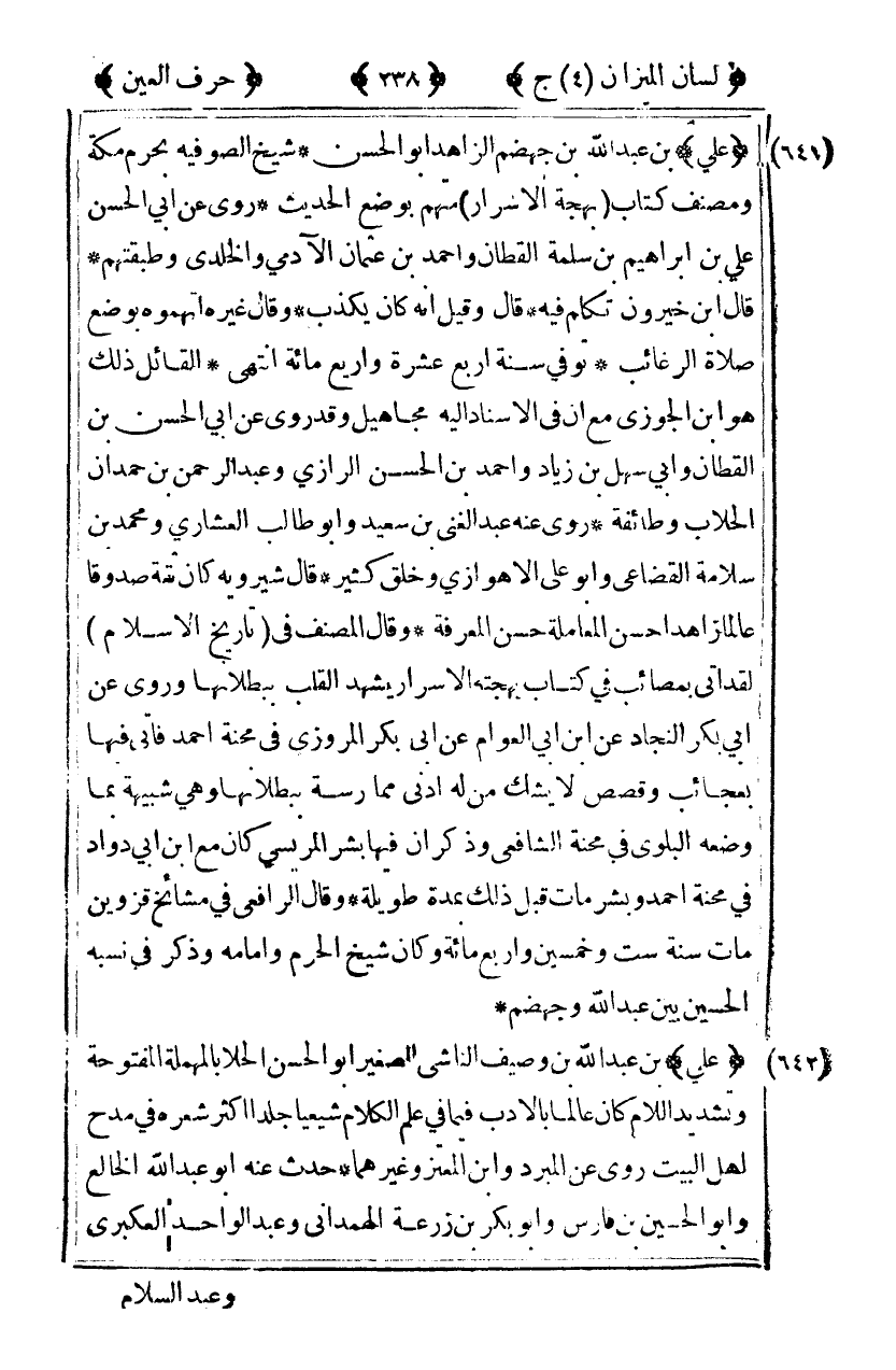 [641] "علي" بن عبد الله ابن جهضم الزاهد أبو الحسن شيخ الصوفية بحرم مكة ومصنف كتاب [بهجة الأسرار] متهم بوضع الحديث روى عن أبي الحسن علي بن إبراهيم بن سلمة القطان وأحمد بن عثمان الآدمي والخلدي وطبقتهم قال ابن خيرون تكلم يه قال وقيل أنه كان يكذب وقال غيره اتهموه بوضع صلاة الرغائب توفي سنة أربع عشرة وأربع مائة انتهى القائل ذلك هو ابن الجوزي مع أن في الإسناد مجاهيل وقد روى عن أبي الحسن بن القطان وأبي سهل بن زيد وأحمد بن الحسن الرازي وعبد الرحمن بن حمدان الحالب وطائفة روى عنه عبد الغني بن سعيد وأبو طالب العشاري ومحمد بن سلامة القضاعي وأبو علي الأهوازي وخلق كثير قال شيرويه كان ثقة صدوق عالما زاهدا حسن المعاملة حسن المعرفة وقال المصنف في [تاريخ الإسلام] لقد أتى بمصائب في كتاب بهجته الأسرار يشهد القلب بطلأنها وروى عن أبي النجاد عن ابن أبي العوام عن أبي بكر المروزي في مجنة أحد فأتى فيها بعجائب وقصص لا يشك من له أدنى ممارسة ببطلأنها وهي شبيهة بما وضعه البلوي في محنة الشافعي وذكر أن فيها بشر المريسي كان مع بن أبي داود في محنة أحمد وبشر مات قبل ذلك بمدة طويلة وقال الرافعي في مشائخ قزوين مات سنة ست وخمسين وأربع مائة وكان شيخ الحرم وإمامه وذكر في نسبه الحسين بين عبد الله وجهضم.