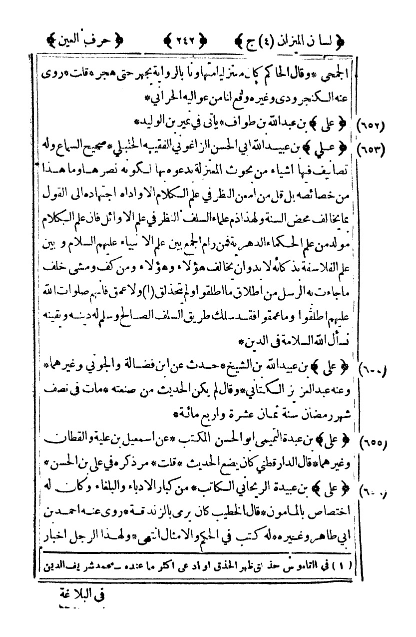 [654] "علي" بن عبيد الله ابن الشيخ حدث عن ابن فاضلة والجوني وغيرهما وعنه عبد العزيز الكتاني وقال لم يكن الحديث من صنعته مات في نصف شهر رمضان سنة ثمان عشرة وأربع مائة.