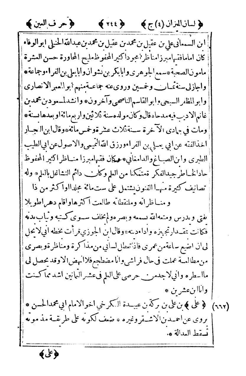 بن السمعاني لي بن عقيل بن محمد بن عقيل بن محمد بن عبد الله الحنبلي أبو الوفاء كان أماما فقيها مبرزا مناظرا مجودا كثير المحفوظ مليح المحاورة حسن العشرة مأمون الصحبة سمع الجوهري وأبا بكر بن نشوان وأبا يعلى بن الفراء وجماعة وأجاز لي سنة ثمان وخمسين وروى عنه جماعة منهم أبو المعمر الأنصاري وأبو المظفر السبحي وأبو القاسم الناصحي وآخرون وأنشد لمسعود بن محمد بن غانم إلاديب فيه مدحا قال وكان مولده سنة ثلاثين وأربع مائة أو بعدها بسنة ومات في جمادي الآخرة سنة ثلاث عشرة وخمس مائة وقال ابن النجار أخذ الفقيه عن أبي يعلى بن الفرا ورزق الله التميمي وإلاصول عن أبي الطيب الطبري وابن الصباغ والدامغاني وكان فقيها مبرزا مناظرا كثير المحفوظ حاد الخاطر جيد الفكرة متمكنا من العلم وكان دائم التشاغل بالعلم وله تصانيف كثيرة منها الفنون يشتمل على ست مائة مجلدا أو أكثر من ذا ومناظراته وملتقطاته طالعت أكثرها وأقام دهرا طويلا يفتي ويدرس ومتعه الله بسمعه وبصره وقال ابن الجوزي قرأت بخطه أني لا يحل لي أن أضيع ساعة من عمري فإذا تعطل لساني من مذاكرة ومناظرة وبصري من مطالعة عملت في حال فراشي وأنا مضطجع فلا أنهض إلا وقد يحصل لي ما أسطره وأني لأجد من حرصي على العلم في عشر الثمانين أشد مما كنت وأنا ابن عشرين.