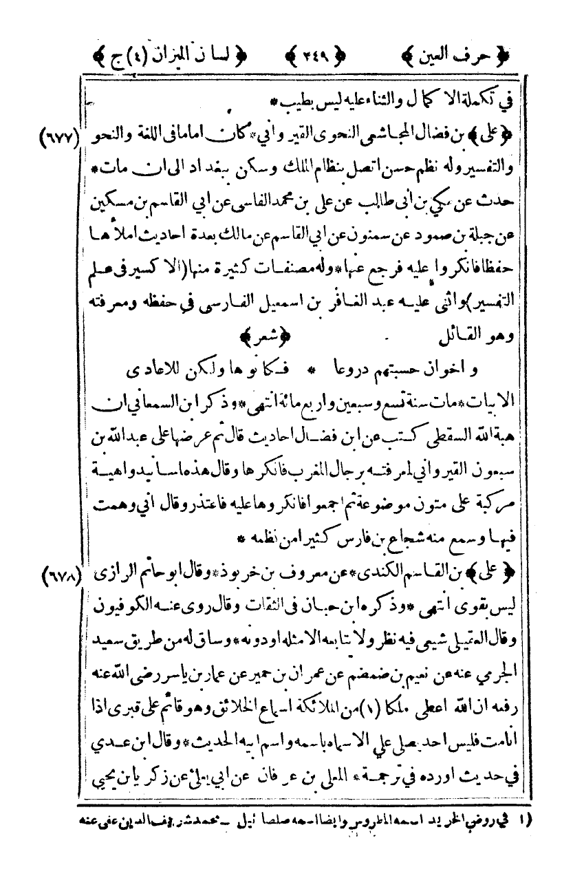 [677] "علي" بن فضالة المجاشعي النحوي القيرواني كان إماما في اللغة والنحو والتفسير وله نظم حسن اتصل بنظام الملك وسكن ببغداد إلى أن مات حدث عن مكي بن أبي طالب عن علي بن محمد الفاسي عن أبي القاسم بن مسكين عن جبلة بن صمود عن سمنون عن أبي القاسم عن مالك بعدة أحاديث املأها حفظا فأنكروا عليه فرجع عنها وله مصنفات كثيرة منها إلاكسير في علم التفسير وأثنى عليه عبد الغافر بن إسمعيل الفارسي في حفظه ومعرفته وهو القائل.