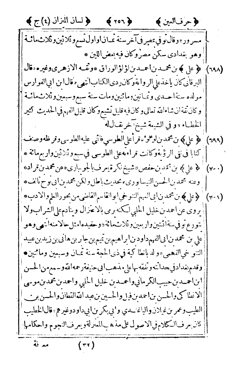 [699] "علي" بن محمد بن لؤلؤ قرأ علي الطوسي فأثنى عليه الطوسي وقرظه وصنف كتابا في نفي الرؤية وكانت قراءته على الطوسي في سبع وثلاثين وأربع مائة.