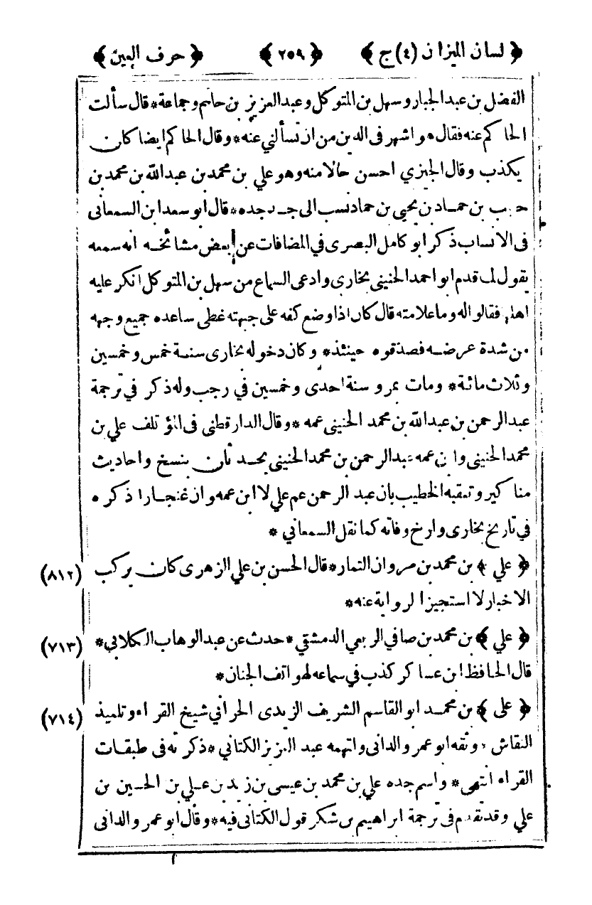 [713] "علي" بن محمد بن صافي الربعي الدمشقي حدث عن عبد الوهاب الكلابي قال الحافظ ابن عساكر كذب في سماعه لهواتف الجنان.