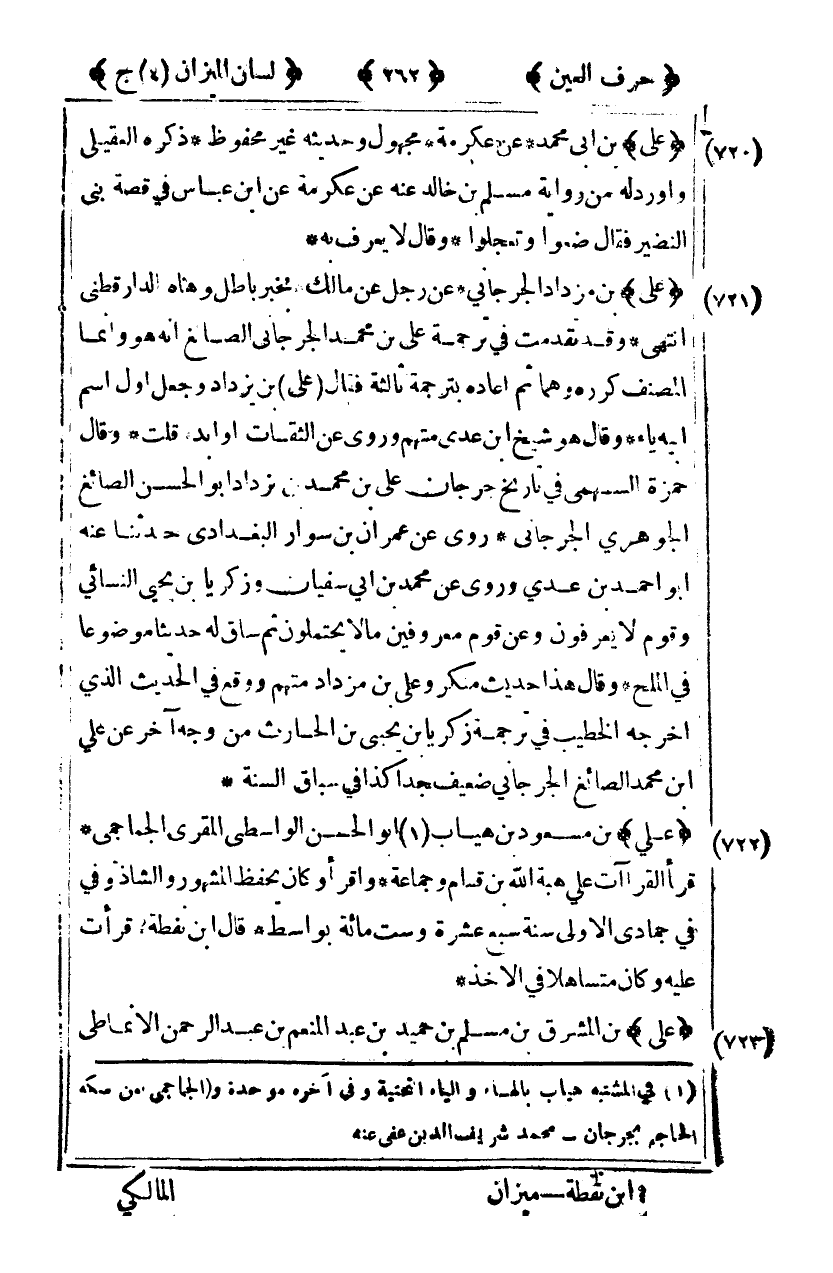 [721] "علي" بن مزداد الجرجاني عن رجل عن مالك بخبر باطل وهاه الدارقطني انتهى وقد تقدمت في ترجمة علي بن محمد الجرجاني الصائغ أنه هو وإنما المصنف كرره وهما ثم أعاده بترجمة ثالثة فقال علي بن يزداد وجعل أول اسم أبيه ياء وقال هو شيخ ابن عدي متهم وروى عن الثقات أوابد قلت وقال حمزة السهمي في تاريخ جرجان علي بن محمد بن يزيداد أبو الحسن الصائغ الجوهري الجرجاني روى عن عمران بن سوار البغدادي حدثنا عنه أبو أحمد بن عدي وروى عن محمد بن أبي سفيان وزكريا بن يحيى النسائي وقوم لا يعرفون وعن قوم معروفين مالا يحتملون ثم ساق له حديثا موضوعا في الملح وقال هذا حديث منكر وعلي بن مزداد متهم ووقع في الحديث الذي أخرجه الخطيب في ترجمة زكريا بن يحيى بن الحارث من وجه آخر عن علي بن محمد الصائغ الجرجاني ضعيف جدا كذا في سباق السنة.