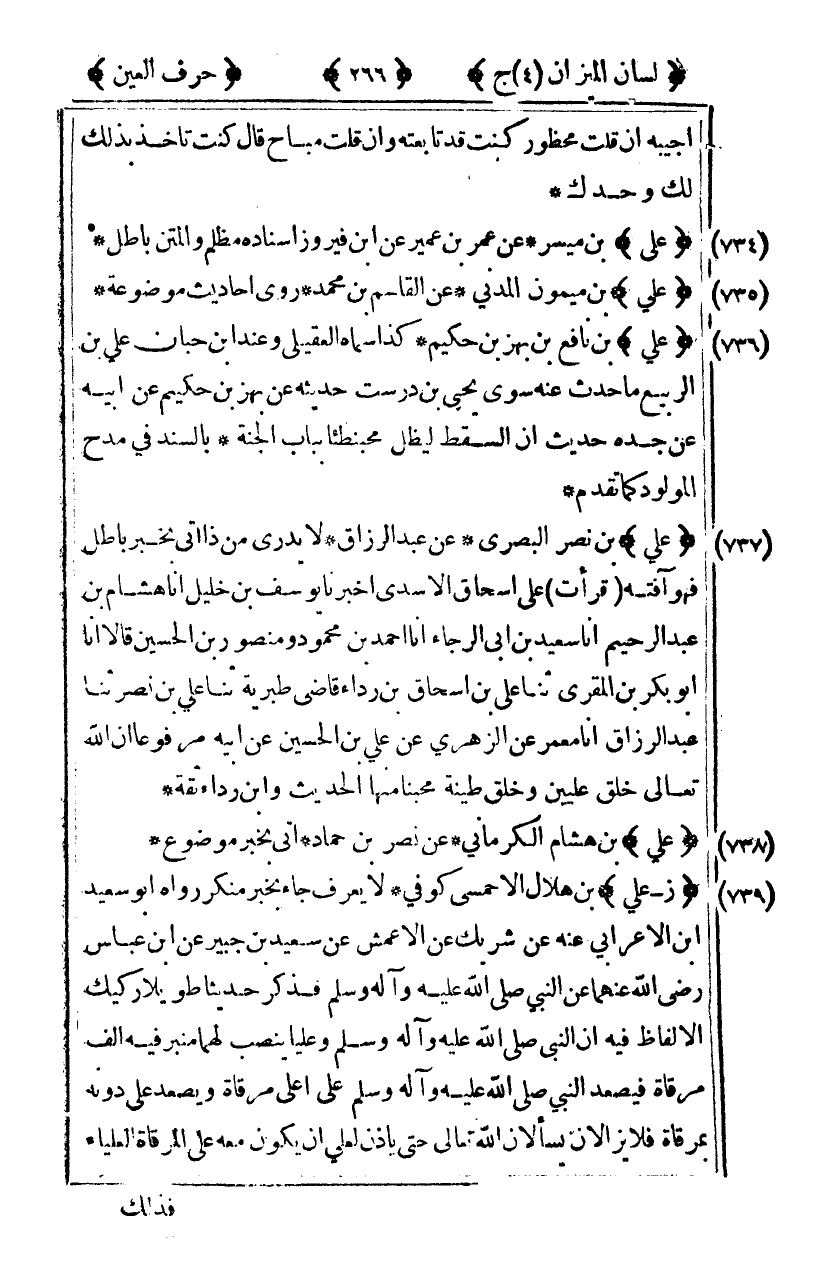 [739] "زعلي" بن هلال إلاحمسي كوفي لا يعرف جاء بخبر منكر رواه أبو سعيد بن الأعرابي عنه عن شريك عن الأعمش عن سعيد بن جبير عن ابن عباس رضي الله عنهما عن النبي صلى الله عليه وآله وسلم فذكر حديثا طويلا ركيك الألفاظ فيه أن النبي صلى الله عليه وآله وسلم وعليا ينصب لهما منبر فيه ألف مرقاة فيصعد النبي صلى الله عليه وآله وسلم على أعلى مرقاة ويصعد علي دونه بمرقاة فلا يزالان يسألان الله تعالى حتى يأذن لعي أن يكون معه على المرقاة العلياء