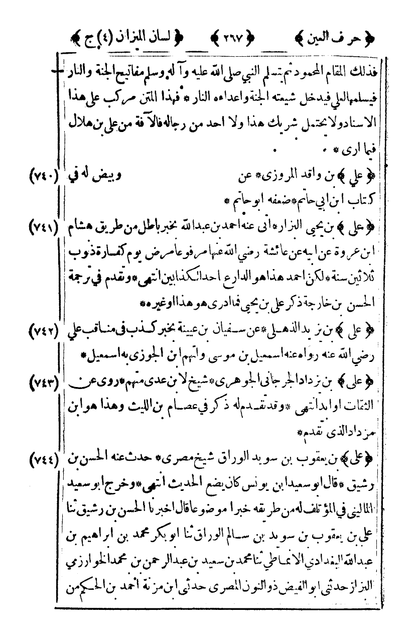[743] علي بن يزداد الجرجاني الجوهري شيخ لا بن عدي متهم روى عن الثقات أوابد انتهى وقد تقدم له ذكر في عصام بن الليث وهذا هو ابن مزداد الذي تقدم.