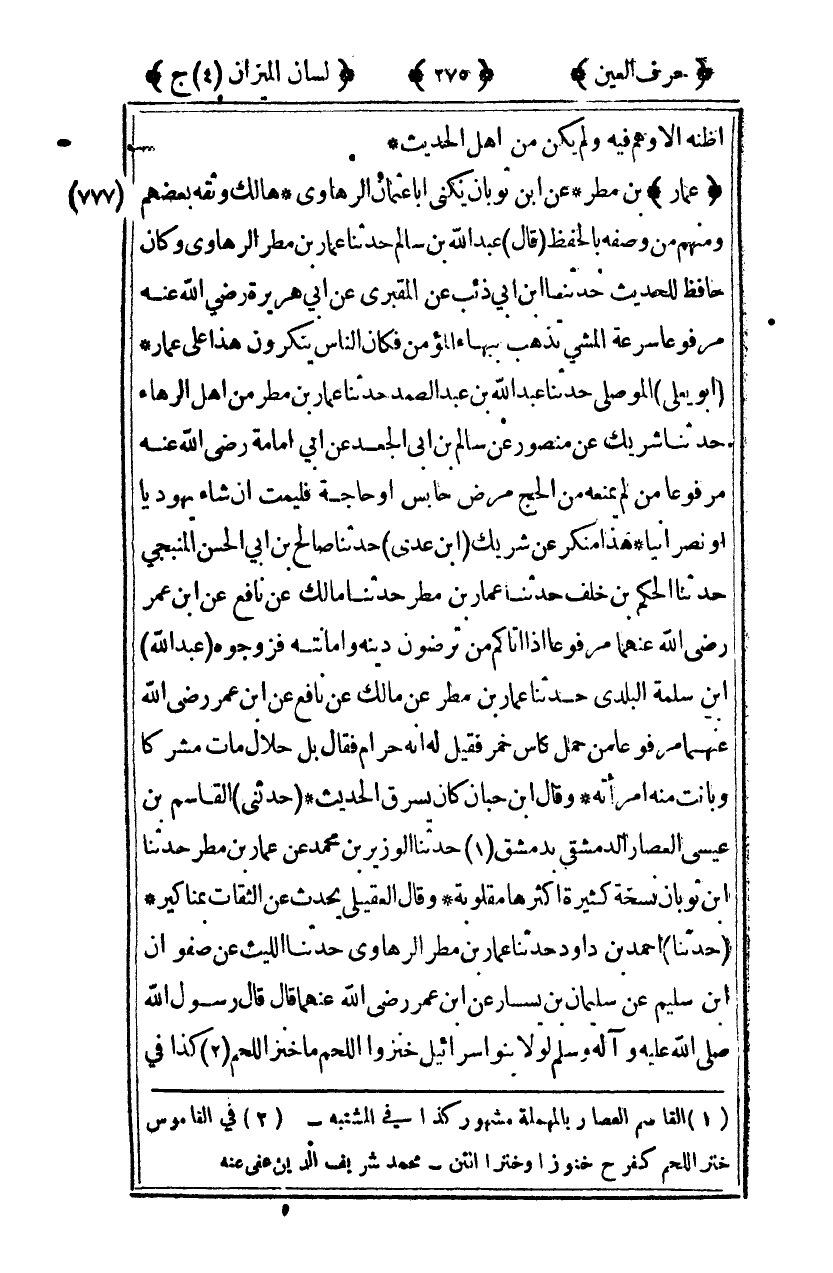 [777] "عمار" بن مطر عن ابن ثوبان يكنى أبا عثمان الرهاوي هالك وثقه بعضهم ومنهم من وصفه بالحفظ [قال] عبد الله بن سالم حدثنا عمار بن مطر الرهاوي وكان حافظ للحديث حدثنا ابن أبي ذئب عن المقبري عن أبي هريرة رضي الله عنه مرفوعا: "سرعة المشي يذهب ببهاء المؤمن" فكان الناس ينكرون هذا على عمار [أبو يعلى] الموصلي حدثنا عبد الله ابن عبد الصمد حدثنا عمار بن مطر من أهل الرهاء حدثنا شريك عن منصور عن سالم بن أبي الجعد عن أبي إمامة رضي الله عنه مرفوعا: "من لم يمنعه من الحج مرض حابس أو حاجة فليمت إن شاء يهوديا أو نصرانيا" هذا منكر عن شريك [ابن عدي] حدثنا صالح بن أبي الحسن المنبجي حدثنا الحكم بن خلف حدثنا عمار بن مطر حدثنا مالك عن نافع عن بن عمر رضي الله عنهما مرفوعا: "إذا أتاكم من ترضون دينه وأمانته فزوجوه" [عبد الله] ابن سلمة البلدي حدثنا عمار بن مطر عن مالك عن نافع عن ابن عمر رضي الله عنهما مرفوعا: "من حمل كأس خمر فقيل له إنه حرام فقال بل حلال مات مشركا وبانت منه امرأته" وقال ابن حبان كان يسرق الحديث [حدثني] القاسم بن عيسى العصار الدمشقي بدمشق1 حدثنا الوزير بن محمد عن عمار بن مطر حدثنا ابن ثوبان نسخة كثيرة أكثرها مقلوبة وقال العقيلي يحدث عن الثقات بمناكير [حدثنا] أحمد بن داود حدثنا عمار بن مطر الرهاوي حدثنا الليث عن صفوان بن سليم عن سليمان بن يسار عن ابن عمر رضي الله عنهما قال: قال رسول الله صلى الله عليه وآله وسلم: "لولا بنو إسرائيل خنزوا اللحم ما خنز اللحم" 2 كذا في