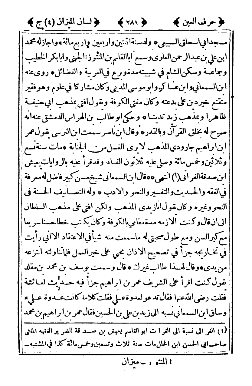 مسجدا أبي إسحاق السبيعي ولد سنة اثنتين وأربعين وأربع مائة وأجاز له محمد بن علي بن عبد الرحمن العلوي وسمع أبا القاسم بن المنتوز1 الجهني وأبا بكر الخطيب وجماعة وسكن الشام في شبيبته مدة وبرع في العربية والفضائل روى عنه ابن السمعاني وابن عساكر وأبو موسى المديني وكان مشاركا في علوم وهو فقير متقنع خير دين على بدعته وكان مفتي الكوفة ويقول أفتى بمذهب أبي حنيفة ظاهرا وبمذهب زيد تدينا وحكى أبو طالب بن الهرأس الدمشقي عنه أنه صرح له بخلق القرآن وبالقدر وقال ابن ناصر سمعت ابن النرسي يقول عمر بن إبراهيم جارودي المذهب لا يرى الغسل من الجنابة مات سنة تسع وثلاثين وخمس مائة وصلى عليه ثلاثون ألفا وقد قرأ عليه بالروايات يعيش بن صدقة الفراتي2 انتهى قال ابن السمعاني شيخ مسن كبير فاضل له معرفة في الفقه والحديث والتفسير والنحو والأدب وله التصانيف الحسنة في النحو وغيره وكان يقول أنا زيدي المذهب ولكن أفتى على مذهب السلطان إلى أن قال وكنت إلازمه مدة مقامي بالكوفة وكان يكتب خطأ حسنا سريعا مع كبر السن ومع طول صحبتي له ما سمعت منه شيئا في إلاعتقاد إلا أني رأيت في تخارجيه جزأ في تصحيح إلاذان بحي على خير العمل فلما تناولته انتزعه من يدي وقال لهذا طالب غيرك قال وسمعت يوسف بن محمد بن مقلد يقول كنت أقرأ على الشريف عمر بن إبراهيم جزأ فيه حديثه لعائشة فقلت رضي الله عنها فقال تدعو لعدوه علي فقلت كلاما كانت عدوة علي وساق أين السمعاني نسبه إلى زيد بن علي بن الحسين فقال عمر بن إبراهيم بن محمد
