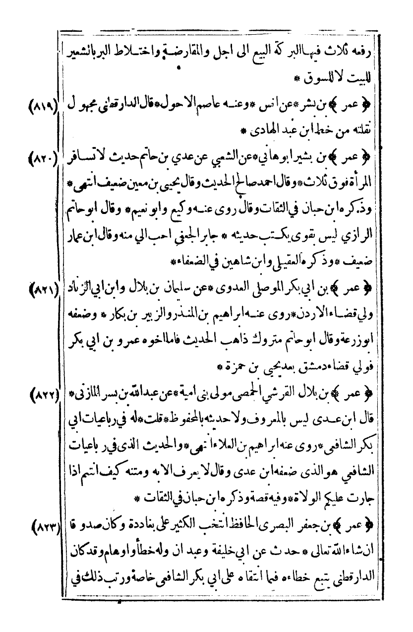 [819] "عمر" بن بشر عن أنس وعنه عاصم الأحول قال الدارقطني مجهول نقلته من خط ابن عبد الهادي.