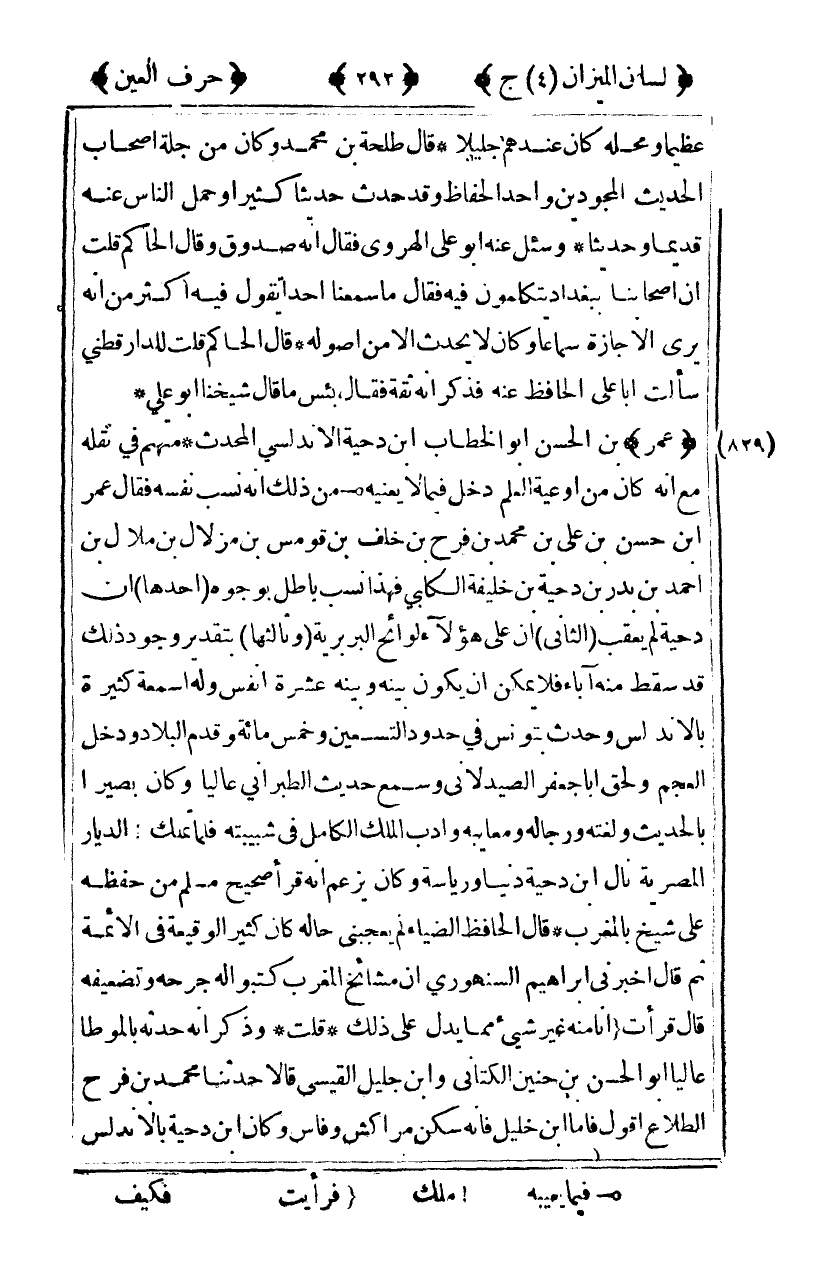 [829] "عمر" بن الحسن أبو الخطاب بن دحية الأندلسي المحدث متهم في نقله مع أنه كان من أوعية العلم دخل فيما لا يعنيه1 من ذلك أنه نسب نفسه فقال عمر بن حسن بن علي بن محمد بن فرح بن خلف بن قومس بن مزلال بن ملال بن أحمد بن بدر بن دحية بن خليفة الكلبي فهذا نسب باطل بوجوه [أحدها] أن دحية لم يعقب [الثاني] أن على هؤلاء لوائح البربرية [وثالثها] بتقدير وجود ذلك قد سقط منه آباء فلا يمكن أن يكون بينه وبينه عشرة أنفس وله أسمعة كثيرة بالأندلس وحدث بتونس في حدود التسعين وخمس مائة وقدم البلاد ودخل العجم ولحق أبا جعفر الصيدلاني وسمع حديث الطبراني عاليا وكان بصيرا بالحديث ولغته ورجاله ومعايبه وأدب الملك الكامل في شبيبته فلما تملك2 الديار المصرية نال بن دحية دنيا ورياسة وكان يزعم أنه قرأ صحيح مسلم من حفظه على شيخ بالمغرب قال الحافظ الضياء لم يعجبني حاله كان كثير الوقيعة في الأئمة ثم قال أخبرني إبراهيم السنهوري أن مشائخ المغرب كتبوا له جرحه وتضعيفه قال قرأت3 أنا منه غير شيء مما يدل على ذلك قلت وذكر أنه حدثه بالموطأ عاليا أبو الحسن بن حنين الكتاني وابن جليل القيسي قالا حدثنا محمد بن فرح الطلاع أقول فأما بن خليل فإنه سكن مراكش وفاس وكان بن دحية بالأندلس