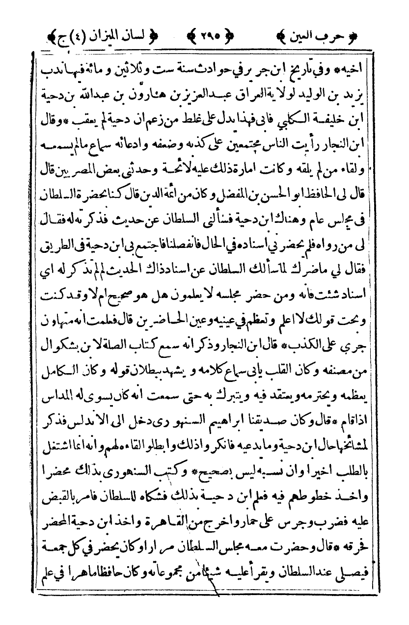 أخيه وفي تاريخ بن جرير في حوادث سنة ست وثلاثين ومائة فيها ندب يزيد بن الوليد لولاية العراق عبد العزيز بن هارون بن عبد الله ابن دحية بن خليفة الكلبي فأبى فهذا يدل على غلط من زعم أن دحية لم يعقب وقال ابن النجار رأيت الناس مجتمعين على كذبه وضعفه وادعائه سماع ما لم يسمعه ولقاء من لم يلقه وكانت امارة ذلك عليه لائحة وحدثني بعض المصريين قال: قال لي الحافظ أبو الحسن بن المفضل وكان من أئمة الدين قال كنا بحضرة السلطان في مجلس عام وهناك بن دحية فسألني السلطان عن حديث فذكرته له فقال لي من رواه فلم يحضرني إسناد في الحال فإنفصلنا فاجتمع بي أبي دحية في الطريق فقال لي ما ضرك لما سألك السلطان عن إسناد ذاك الحديث لم لم تذكر له أي إسناد شئت فإنه ومن حضر مجلسه لا يعلمون هل هو صحيح أم لا وقد كنت وبحت قولك لا أعلم وتعظم في عينيه وعين الحاضرين قال فعلمت أنه متهاون جرى على الكذب قال ابن النجار وذكر أنه سمع كتاب الصلة لابن بشكوال من مصنفه وكان القلب يأبى سماع كلامه ويشهد ببطلان قوله وكان الكامل يعظمه ويحترمه ويعتقد فيه ويتبرك به حتى سمعت أنه كان يسوي له المداس إذا قام قال وكان صديقنا إبراهيم السنهوري دخل إلى الأندلس فذكر لمشائخها حال بن دحية وما يدعيه فأنكروا ذلك وأبطلوا لقاءه لهم وأنه إنما اشتغل بالطلب أخيرا وأن نسبه ليس بصحيح وكتب السنهوري بذلك محضرا وأخذ خطوطهم فيه فعلم بن دحية بذلك فشكاه للسلطان فأمر بالقبض عليه فضرب وجرس على حمار وأخرج من القاهرة وأخذ بن دحية المحضر فحرقه قال وحضرت معه مجلس السلطان مرارا وكان يحضر في كل جمعة فيصلي عند السلطان ويقرأ عليه شيئا من مجموعاته وكان حافظا ماهرا في علم