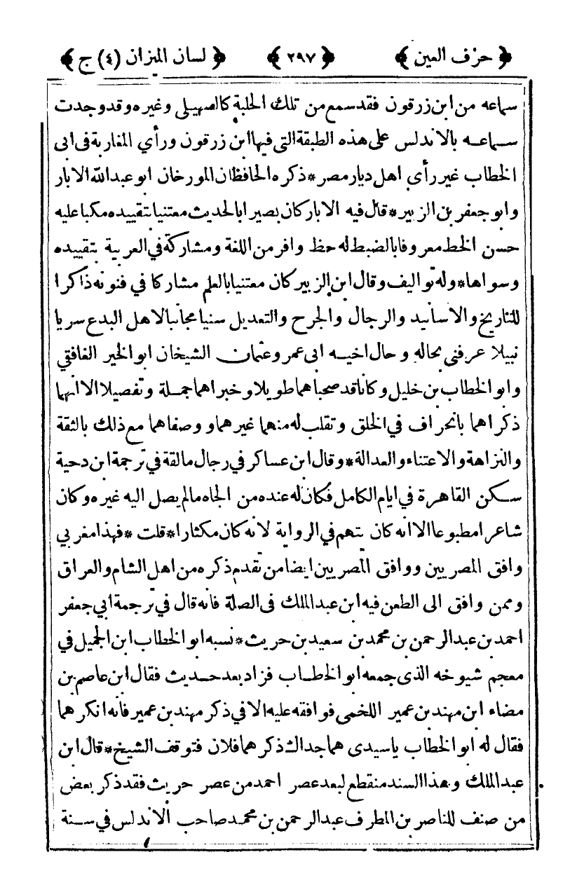 سماعه من ابن زرقون فقد سمع من تلك الحلبة كالسهيلي وغيره وقد وجدت سماعه بالأندلس على هذه الطبقة التي فيها ابن زرقون ورأي المغاربة في أبي الخطاب غير رأي أهل ديار مصر ذكره الحافظان المؤرخان أبو عبد الله الأبار وأبو جعفر بن الزبير قال فيه الأبار كان بصيرا بالحديث معتنيا بتقييده مكبا عليه حسن الخط معروفا بالضبط له حظ وافر من اللغة ومشاركة في العربية بتقييده وسواها وله تواليف وقال ابن الزبير كان معتنيا بالعلم مشاركا في فنونه ذاكرا للتاريخ والأسانيد والرجال والجرح والتعديل سنيا مجانبا لأهل البدع سريا نبيلا عرفني بحاله وحال أخيه أبي عمر وعثمان الشيخان أبو الخير الغافقي وأبو الخطاب بن خليل وكانا قد صحباهما طويلا وخبراهما جملة وتفصيلا إلا أنهما ذكراهما بانحراف في الخلق وتقلب له منهما غيرهما ووصفاهما مع ذلك بالثقة والنزاهة الإعتناء والعدالة وقال ابن عساكر في رجال مالقة في ترجمة بن دحية سكن القاهرة في أيام الكامل فكان له عنده من الجاه ما لم يصل إليه غيره وكان شاعرا مطبوعا إلا أنه كان يتهم في الرواية لأنه كان مكثارا قلت فهذا مغربي وافق المصريين ووافق المصريين أيضا من تقدم ذكره من أهل الشام والعراق وممن وافق إلى الطعن فيه بن عبد الملك في الصلة فإنه قال في ترجمة أبي جعفر أحمد بن عبد الرحمن بن محمد بن سعيد بن حريث نسبه أبو الخطاب بن الجميل في معجم شيوخه الذي جمعه أبو الخطاب فزاد بعد حديث فقال ابن عاصم بن مضاء بن مهند بن عمير اللخمي فوافقه عليه إلا في ذكر مهند بن عمير فإنه انكرهما فقال له أبو الخطاب يا سيدي هما جداك ذكرهما فلان فتوقف الشيخ قال ابن عبد الملك وهذا السند منقطع لبعد عصر أحمد من عصر حريث فقد ذكر بضع من صنف للناصر بن المطرف عبد الرحمن بن محمد صاحب الأندلس في سنة