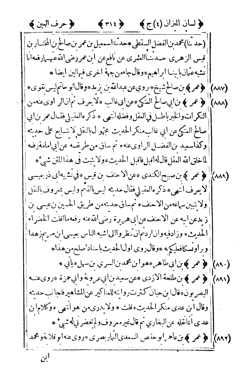 [891] "عمر" بن طلحة الأزدي عن سعيد بن أبي عروبة وأبي حمزة روى عنه البصريون قال ابن حبان كثرت روايته للمناكير عن المشاهي فتجانب حديثه وقال ابن عدي منكر الحديث قلت ولا يدرى من هو انتهى وكلام ابن عدي إنما نقله عن البخاري ثم قال غير معروف ولم يحضرني له شيء.