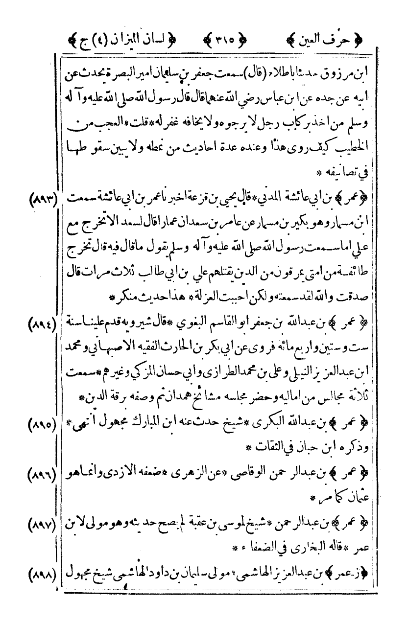 [896] "عمر" بن عبد الرحمن الوقاصي عن الزهري ضعفه الأزدي وإنما هو عثمان كما مر.
