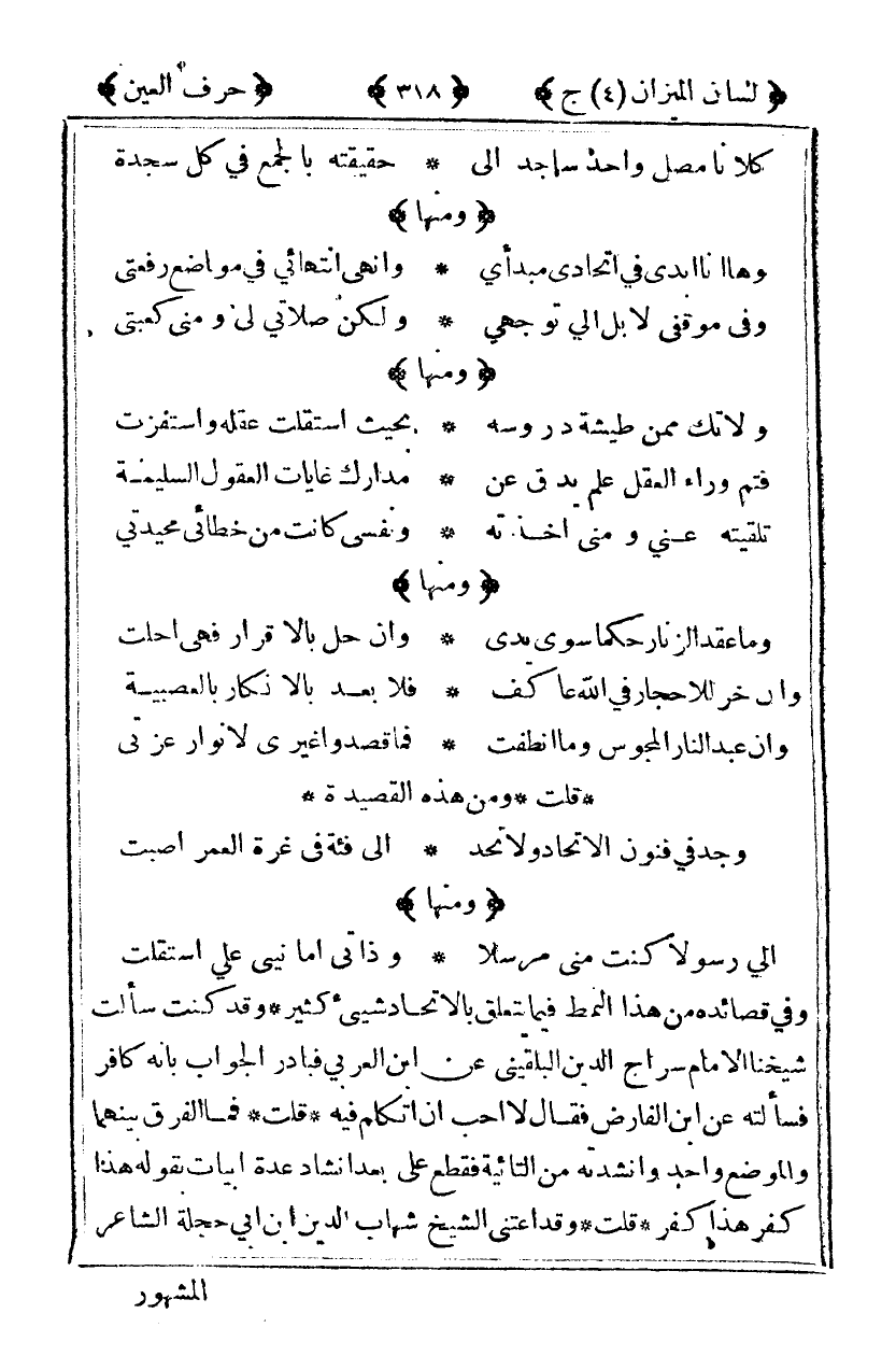 وفي قصائده من هذا النمط فيما يتعلق بإلاتحاد شيء كثير وقد كنت سألت شيخنا الإمام سراح الدين البلقيني عن ابن العربي فبادر الجواب بأنه كافر فسألته عن ابن الفارض فقال لا أحب أن أتكلم فيه قلت فما الفرق بينهما والموضع واحد وأنشدته من التائية فقطع علي بعد إنشاد عدة أبيات بقوله هذا كفر هذا كفر قلت وقد اعتنى الشيخ شهاب الدين ابن أبي حجلة الشاعر
