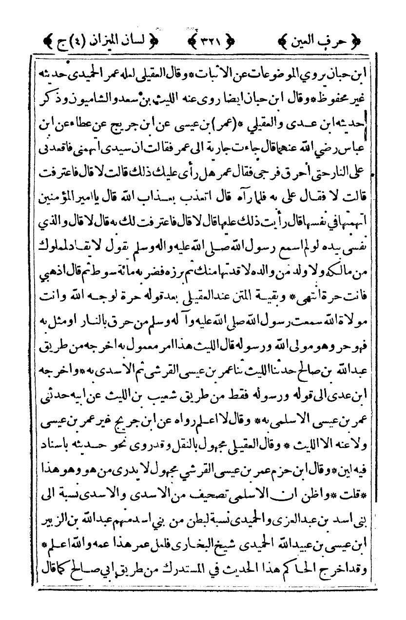 ابن حبان يروي الموضوعات عن الإثبات وقال العقيلي لعله عمر الحميدي حديثه غير محفوظ وقال ابن حبان أيضا روى عنه الليث بن سعد والشاميون وذكر حديثه بن عدي والعقيلي عمر بن عيسى عن ابن جريج عن عطاء عن ابن عباس رضي الله عنهما قال جاءت جارية إلى عمر فقالت إن سيدي اتهمني فاقعدني على النار حتى أحرق فرجي فقال عمر هل رأى عليك ذلك قالت لا قال فاعترفت قالت لا فقال علي به فلما رآه قال أتعذب بعذاب الله قال يا أمير المؤمنين اتهمتها في نفسها قال رأيت ذلك عليها قال لا قال فاعترفت لك به قال لا قال والذي نفسي بيده لو لم أسمع رسول الله صلى الله عليه وآله وسلم يقول: "لا يقاد لمملوك من مالكه ولا ولد من والده" لأقتدتها منك ثم برزه فضربه مائة سوط قال اذهبي فأنت حرة انتهى وبقية المتن عند العقيلي بعد قوله حرة لوجه الله وأنت مولاة الله سمعت رسول الله صلى الله عليه وآله وسلم يقول: "من حرق بالنار أو مثل به فهو حر وهو مولى الله ورسوله" قال الليث هذا أمر معمول به أخرجه من طريق عبد الله ابن صالح حدثنا الليث ثنا عمر بن عيسى القرشي ثم الأسدي به وأخرجه ابن عدي إلى قوله ورسوله فقط من طريق شعيب بن الليث عن أبيه حدثني عمر بن عيسى الأسلمي به وقال لا أعلم رواه عن ابن جريج غير عمر بن عيسى ولا عنه إلا الليث وقال العقيلي مجهول بالنقل وقد روى نحو حديثه بإسناد فيه لين وقال ابن حزم عمر بن عيسى القرشي مجهول لا يدرى من هو وهو هذا قلت وأظن أن الأسلمي تصحيف من الأسدي والأسدي نسبة إلى بني أسد بن عبد العزى والحميدي نسبة لبطن من بني أسد منهم عبد الله ابن الزبير بن عيسى بن عبيد الله الحميدي شيخ البخاري فلعل عمر هذا عمه والله أعلم وقد أخرج الحاكم هذا الحديث في المستدرك من طريق أبي صالح كما قال