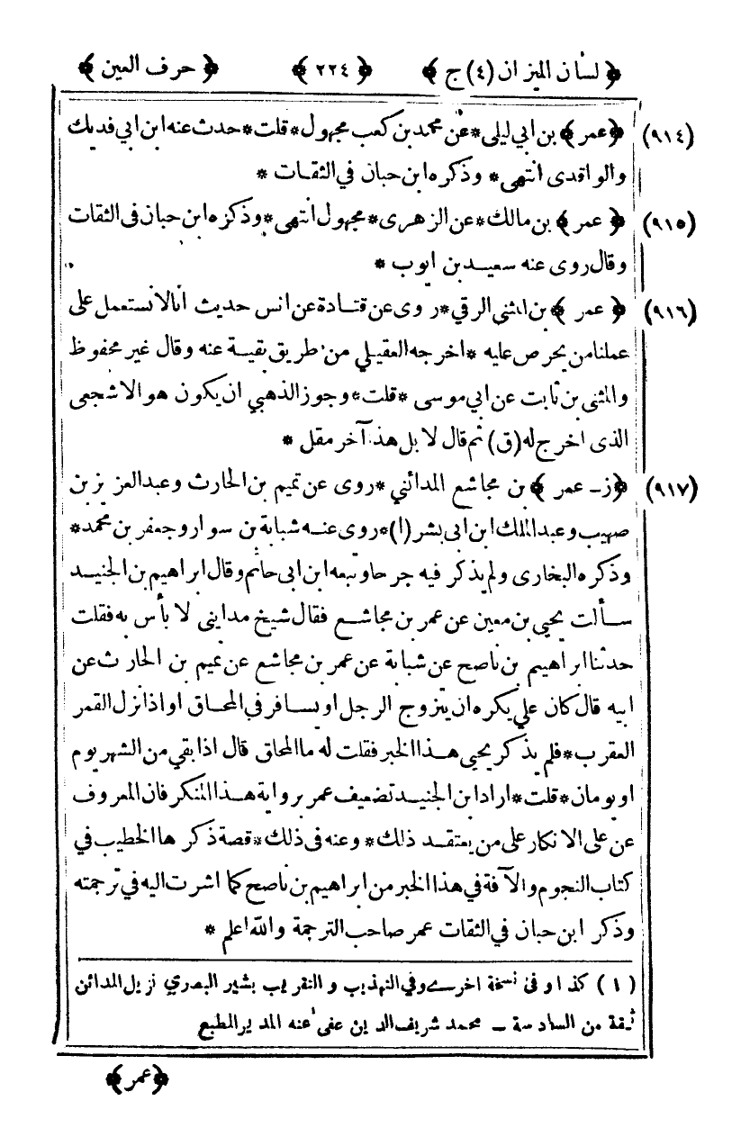 [917] "زعمر" بن مجاشع المدائني روى عن تميم بن الحارث وعبد العزيز بن صهيب وعبد الملك بن أبي بشر1 روى عنه شبابة بن سوار وجعفر بن محمد وذكره البخاري ولم يذكر فيه جرحا وتبعه بن أبي حاتم وقال إبراهيم بن الجنيد سألت يحيى بن معين عن عمر بن مجاشع فقال شيخ مدايني لا بأس به فقلت حدثنا إبراهيم بن ناصح عن شبابة عن عمر بن مجاشع عن تميم بن الحارث عن أبيه قال كان علي يكره أن يتزوج الرجل أو يسافر في المحاق أو إذا نزل القمر العقرب فلم يذكر يحيى هذا الخبر فقلت له ما المحاق قال إذا بقي من الشهر يوم أو يومان قلت أراد بن الجنيد تضعيف عمرو برواية هذا المنكر فإن المعروف عن علي إلانكار على من يعتقد ذلك وعنه في ذلك قصة ذكرها الخطيب في كتاب النجوم والآفة في هذا الخبر من إبراهيم بن ناصح كما أشرت إليه في ترجمته وذكره ابن حبان في الثقات عمر صاحب الترجمة والله أعلم.