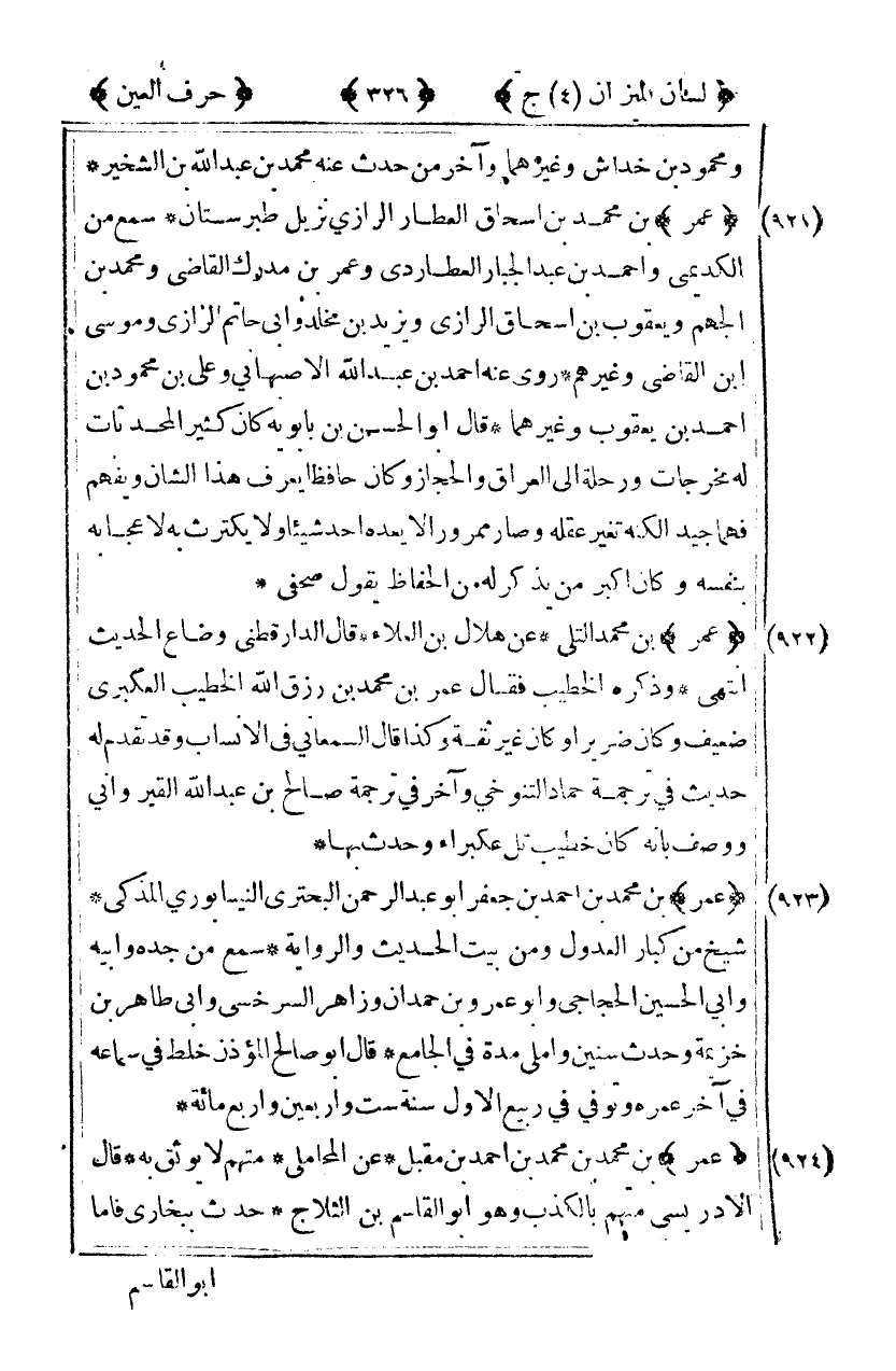 [924] "عمر" بن محمد بن محمد بن أحمد بن مقبل عن المحاملي متهم لا يوثق به قال الإدريسي متهم بالكذب وهو أبو القاسم بن الثلاج حدث ببخارى فأما