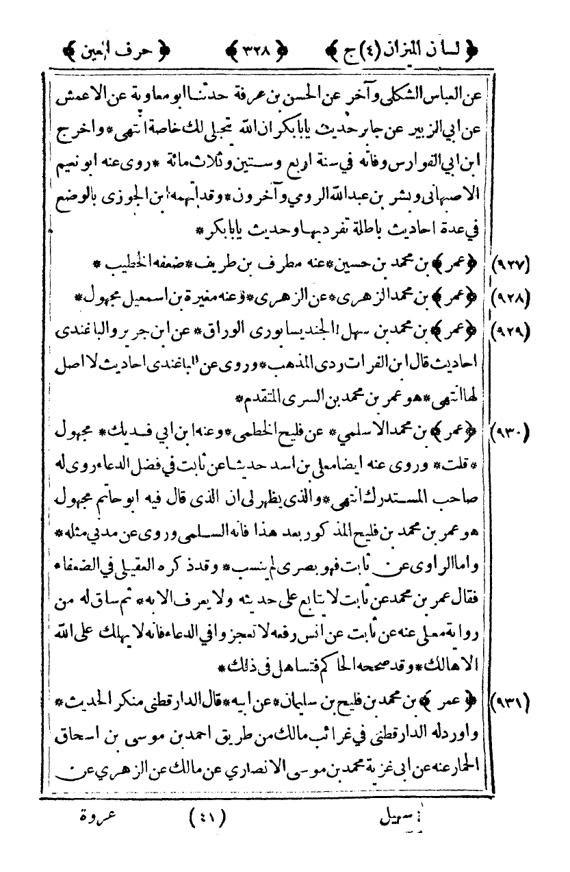 [927] "عمر" بن محمد بن حسين عنه مطرف بن طريف ضعفه الخطيب.