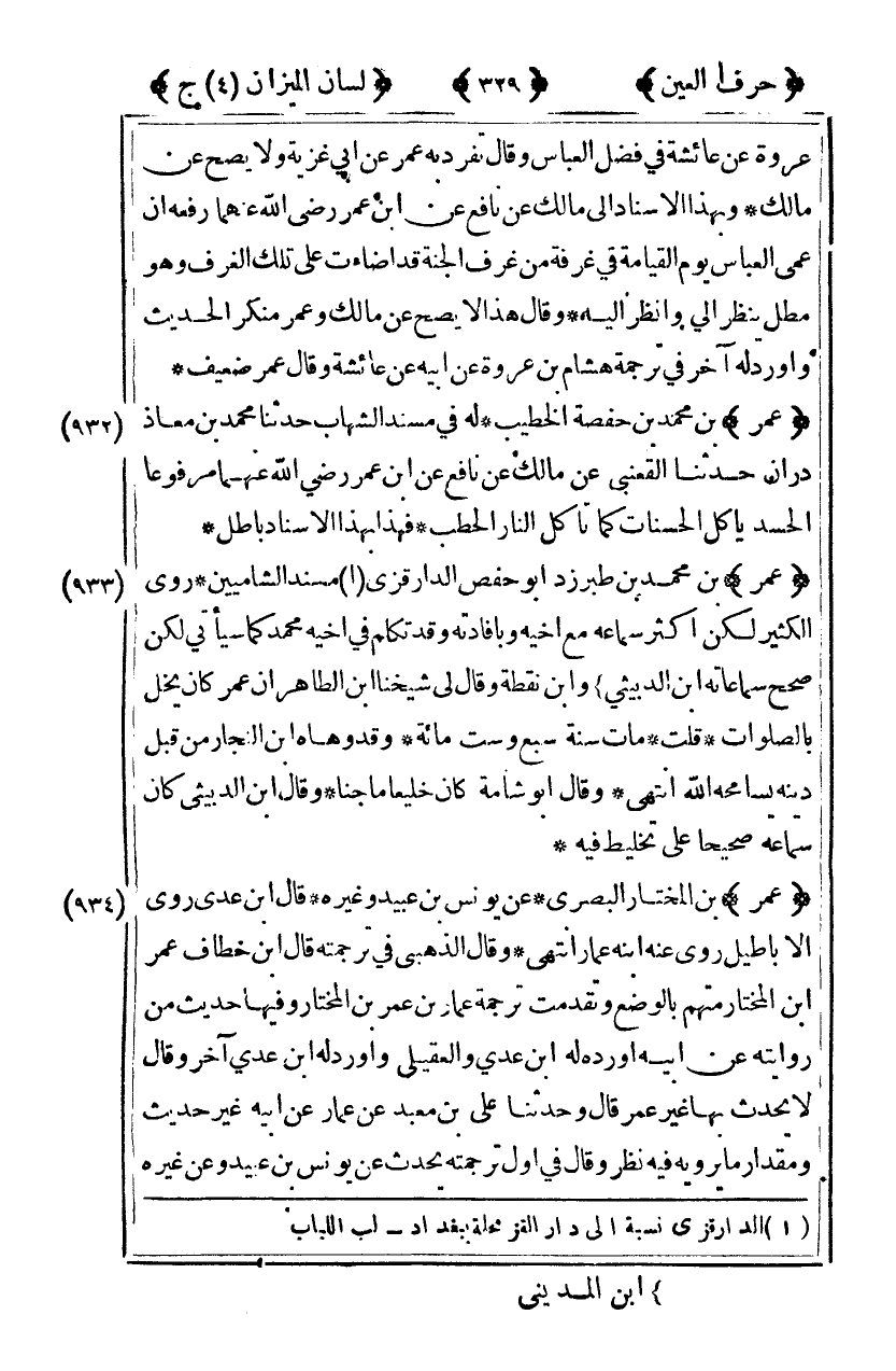 [934] "عمر" بن المختار البصري عن يونس بن عبيد وغيره قال ابن عدي روى الأباطيل روى عنه ابنه عمار انتهى وقال الذهبي في ترجمته قال ابن خطاف عمر بن المختار متهم بالوضع وتقدمت ترجمة عمار ابن عمر بن المختار وفيها حديث عن روياته عن أبيه أورد له ابن عدي والعقيلي وأورد له ابن عدي آخر وقال لا يحدث بها غير عمر قال وحدثنا علي بن معبد عن عمار عن أبيه غير حديث ومقدار ما يرويه فيه نظر وقال في أول ترجمته يحدث عن يونس بن عبيد وعن غيره