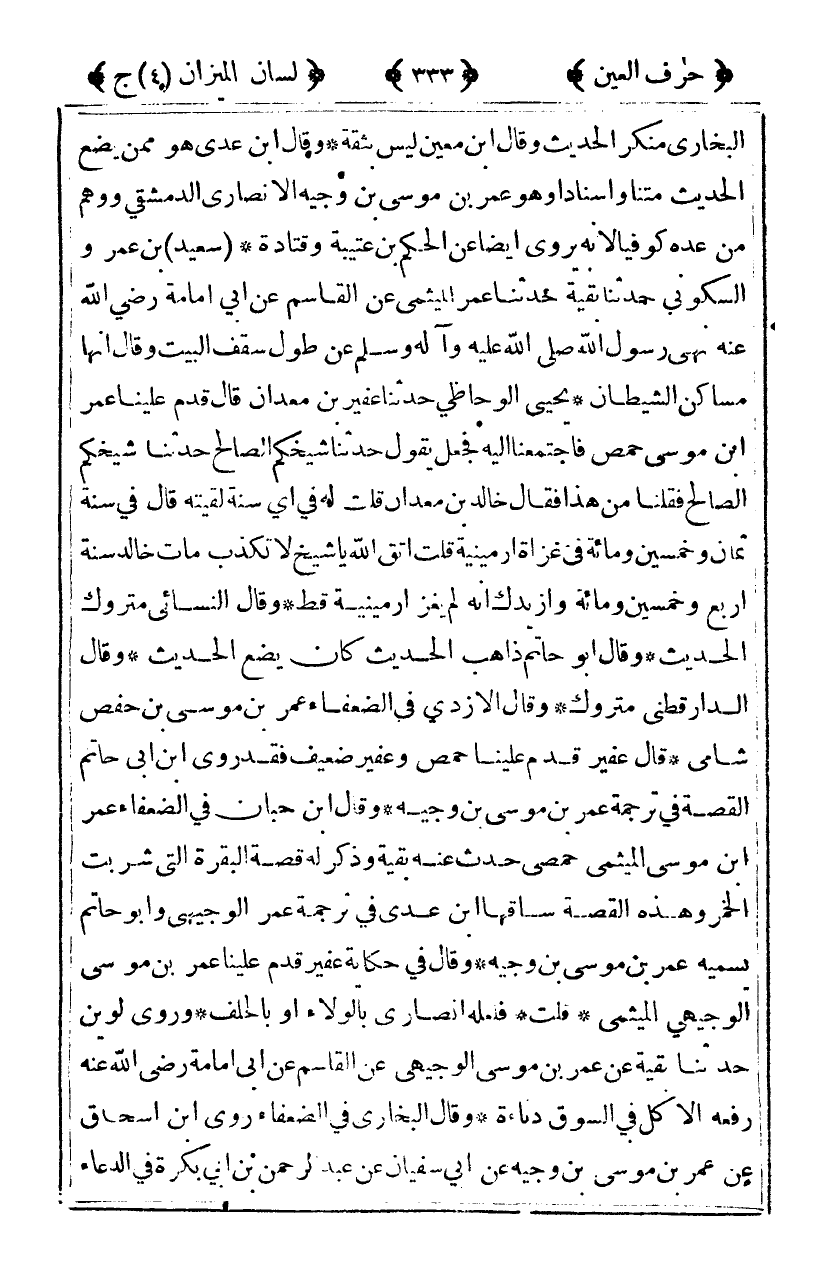 البخاري منكر الحديث وقال ابن معين ليس بثقة وقال ابن عدي هو ممن يضع الحديث متنا واسنادا وهو عمر بن موسى بن وجيه الأنصاري الدمشقي ووهم من عده كوفيا لأنه يروي أيضا عن الحكم بن عتيبة وقتادة [سعيد] بن عمرو السكوني حدثنا بقية حدثنا عمر الميثمي عن القاسم عن أبي إمامة رضي الله عنه نهى رسول الله صلى الله عليه وآله وسلم عن طول سقف البيت وقال: "إنها مساكن الشيطان" يحيى الوحاظي حدثنا عفير بن معدان قال قدم علينا عمر بن موسى حمص فاجتمعنا إليه فجعل يقول حدثنا شيخكم الصالح حدثنا شيخكم الصالح فقلنا من هذا فقال خالد بن معدان قلت له في أي سنة لقيته قال في سنة ثمان وخمسين ومائة في غزاة أرمينية قلت اتق الله يا شيخ لا تكذب مات سنة أربع وخمسين ومائة وأزيدك أنه لم يغز أرمينية قط وقال النسائي متروك الحديث وقال أبو حاتم ذاهب الحديث كان يضع الحديث وقال الدارقطني متروك وقال الإزجي في الضعفاء عمر بن موسى بن حفص شامي قال عفير قدم علينا حمص وعفير ضعيف فقد روى ابن أبي حاتم القصة في ترجمة عمر بن موسى بن وجيه وقال ابن حبان في الضعفاء عمر بن موسى الميثمي حمصي حدث عنه بقية وذكر له قصة البقرة التي شربت الخمر وهذه القصة ساقها ابن عدي في ترجمة عمر الوجيهي وأبو حاتم يسميه عمر بن موسى بن وجيه وقال في حكاية عفير قدم علينا عمر بن موسى الوجيهي الميثمي قلت فلعله أنصاري بالولاء أو بالحلف وروى لوين حدثنا بقية عن عمر بن موسى الوجيهي عن القاسم عن أبي إمامة رضي الله عنه رفعه الأكل في السوق دناءة وقال البخاري في الضعفاء روى ابن إسحاق عن عمر بن موسى بن وجيه عن أبي سفيان عن عبد الرحمن بن أبي بكر في الدعاء