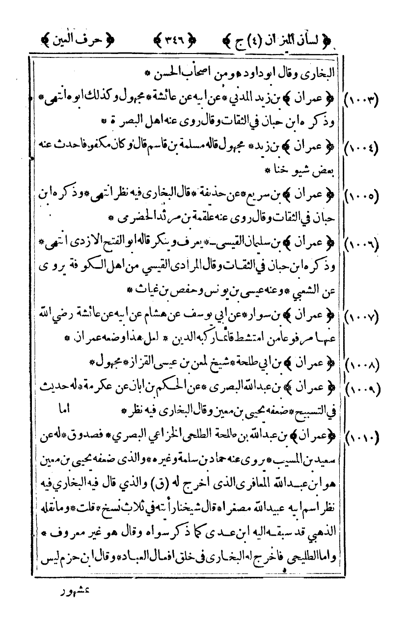 [1009] "عمران" بن عبد الله البصري عن الحكم بن أبان عن عكرمة له حديث في التسبيح ضعفه يحيى بن معين وقال البخاري فيه نظر أما.