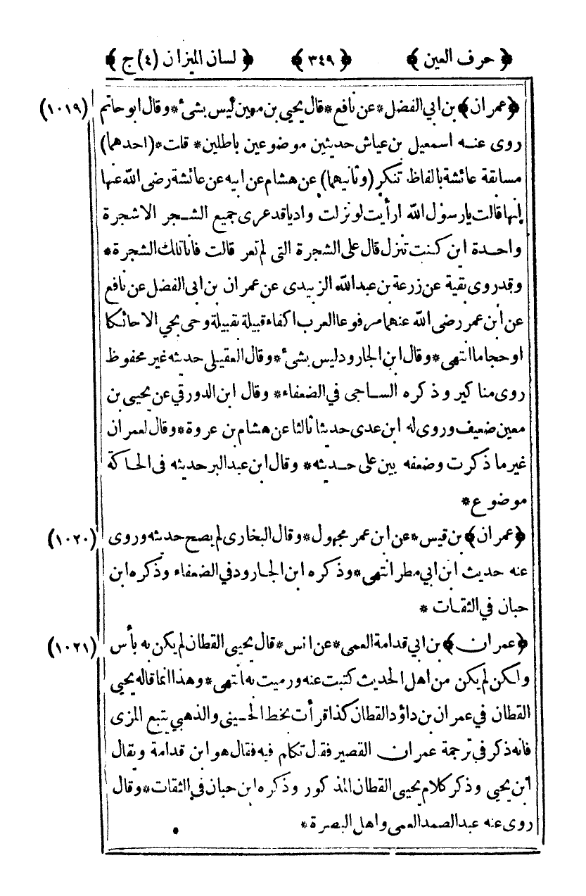 [1020] "عمران" بن قيس عن ابن عمر مجهول وقال البخاري لم يصح حديثه وروى عنه حديث ابن أبي مطر انتهى وذكره ابن الجارود في الضعفاء وذكره ابن حبان في الثقات.