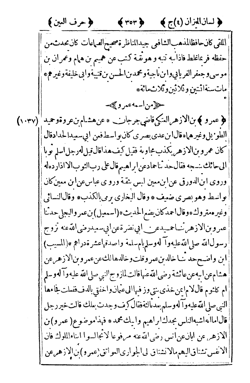[1037] "عمرو" بن الأزهر العتكي قاضي جرجان عن هشام بن عروة وحميد الطويل وغيرهما قال ابن عدي بصري كان بواسط فعن أبي سعيد الحداد قال كان عمرو بن الأزهر يكذب مجاوبة فقيل كيف هذا قال قيل له رجل أسلم ثوبا إلى حائك ينسجه فقال حدثنا حماد عن إبراهيم قال على رب الثوب إلا إذا رده له وروى ابن الدورقي عن ابن معين ليس بثقة وروى عباس عن ابن معين كان بواسط وهو بصري ضعيف وقال البخاري يرمي بالكذب وقال النسائي وغيره متروك وقال أحمد كان يضع الحديث [إسمعيل] بن عمر والبجلي حدثنا عمرو بن الأزهر ثنا حميد عن أبي نضرة عن أبي سعيد رضي الله عنه تزوج رسول الله صلى الله عليه وآله وسلم بأم سلمة وأصدقها عشرة دارهم [المسيب] بن واضح حدثنا خالد ابن عمرو قلت وخالد هالك عن عمرو بن الأزهر عن هشام عن أبيه عن عائشة رضي الله عنها قالت لما زوج النبي صلى الله عليه وآله وسلم أم كلثوم قال لأم أيمن: "خذي بنتي وزفيها إلى عثمان واخفقي بالدف" ففعلت فجاءها النبي صلى الله عليه وآله وسلم بعد ثالثة فقال: "كيف وجدت بعلك" قالت خير رجل قال: "أما إنه أشبه الناس بجدك إبراهيم وأبيك محمد" فهذا موضوع [عمرو] بن الأزهر عن أبان عن أنس رضي الله عنه مرفوعا: "لا تجالسوا أبناء الملوك فإن الأنفس تشتاق إليهم ما لا تشتاق إلى الجواري العواتق" [عمرو] بن الأزهر عن