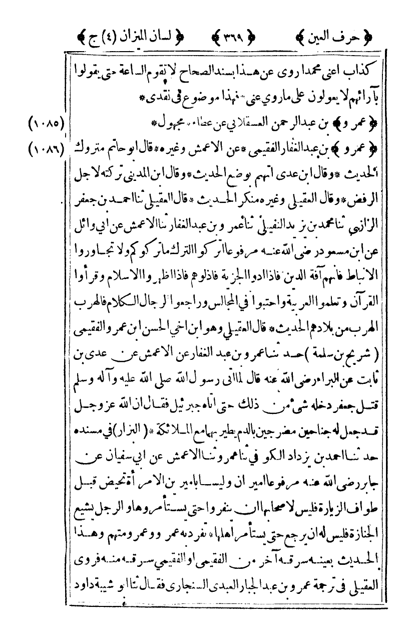 [1086] "عمرو" بن عبد الغفار الفقيمي عن الأعمش وغيره قال أبو حاتم متروك الحديث وقال ابن عدي اتهم بوضع الحديث وقال ابن المديني تركته لأجل الرفض وقال العقيلي وغيره منكر الحديث قال العقيلي ثنا أحمد بن جعفر الرازي ثنا محمد يزيد النفيلي ثنا عمرو بن عبد الغفار ثنا الأعمش عن أبي وائل عن ابن مسعود رضي الله عنه مرفوعا: "اتركوا الترك ما تركوكم ولا تجاوروا الإنباط فإنهم آفة الدين فإذا أدوا الجزية فأذلوهم فإذا أظهروا الإسلام وقرأوا القرآن وتعلموا العربية واحتجوا في المجالس وراجعوا الرجال الكلام فالهرب الهرب من بلادهم" الحديث قال العقيلي وهو ابن أخي الحسن ابن عمرو الفقيمي [شريح بن سلمة] حدثنا عمرو بن عبد الغفار عن الأعمش عن عدي بن ثابت عن البراء رضي الله عنه قال لما أتى رسول الله صلى الله عليه وآله وسلم قتل جعفر دخله شيء من ذلك حتى أتاه جبرائيل فقال: "إن الله عز وجل قد جعل له جناحين مضرجين بالدم يطير بهما مع الملائكة" [البزار] في مسنده حدثنا أحمد بن يزيداد الكوفي ثنا عمرو ثنا الأعمش عن أبي سفيان عن جابر رضي الله عنه مرفوعا أمير أن وليسا بأميرين إلا امرأة تحيض قبل طواف الزيارة فليس لأصحابها أن ينفروا حتى يستأمروها والرجل يشيع الجنازة فليس له أن يرجع حتى يستأمر أهلها تفرد به عمرو وعمرو متهم وهذا الحديث بعينه سرقه آخر من الفقيمي والفقيمي سرقه منه فروى العقيلي في ترجمة عمرو بن عبد الجبار العبدي السنجاري فقال ثنا أبو شيبة داود