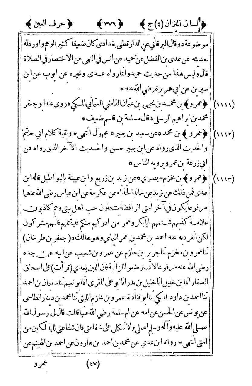 [1111] "عمرو" بن محمد بن يحيى بن عثمان القاضي العثماني المكي روى عنه أبو جعفر محمد بن إبراهيم الرسلي قال مسلمة بن قاسم ضعيف.