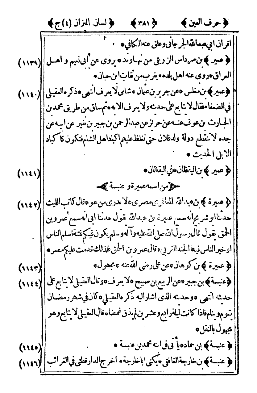 [1144] "عنبسة" بن جبير عن الربيع بن صبيح لا يعرف وقال العقيلي لا يتابع على حديثه انتهى وحديثه الذي أشار إليه ذكره العقيلي كان في شهر رمضان يقول وينام فإذا كانت ليلة رابع وعشرين لم يذق غمضا قال العقيلي لا يتابع وهو مجهول بالنقل.