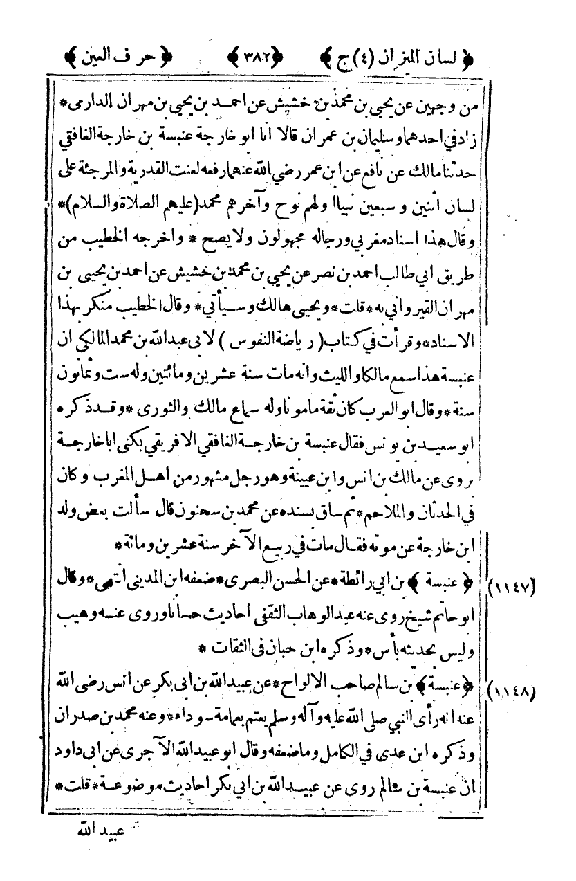 [1148] "عنبسة" بن سالم صاحب إلالواح عن عبيد الله ابن أبي بكر عن أنس رضي الله عنه أنه رأى النبي صلى الله عليه وآله وسلم يعتم بعمامة سوداء وعنه محمد بن صدر أن وذكره ابن عدي في الكامل وما ضعفه وقال أبو عبيد الله الأجري عن أبي داود أن عنبسة بن سالم روى عن عبيد الله ابن أبي بكر أحاديث موضوعة قلت